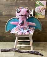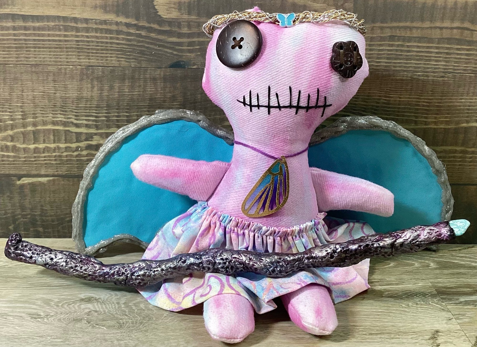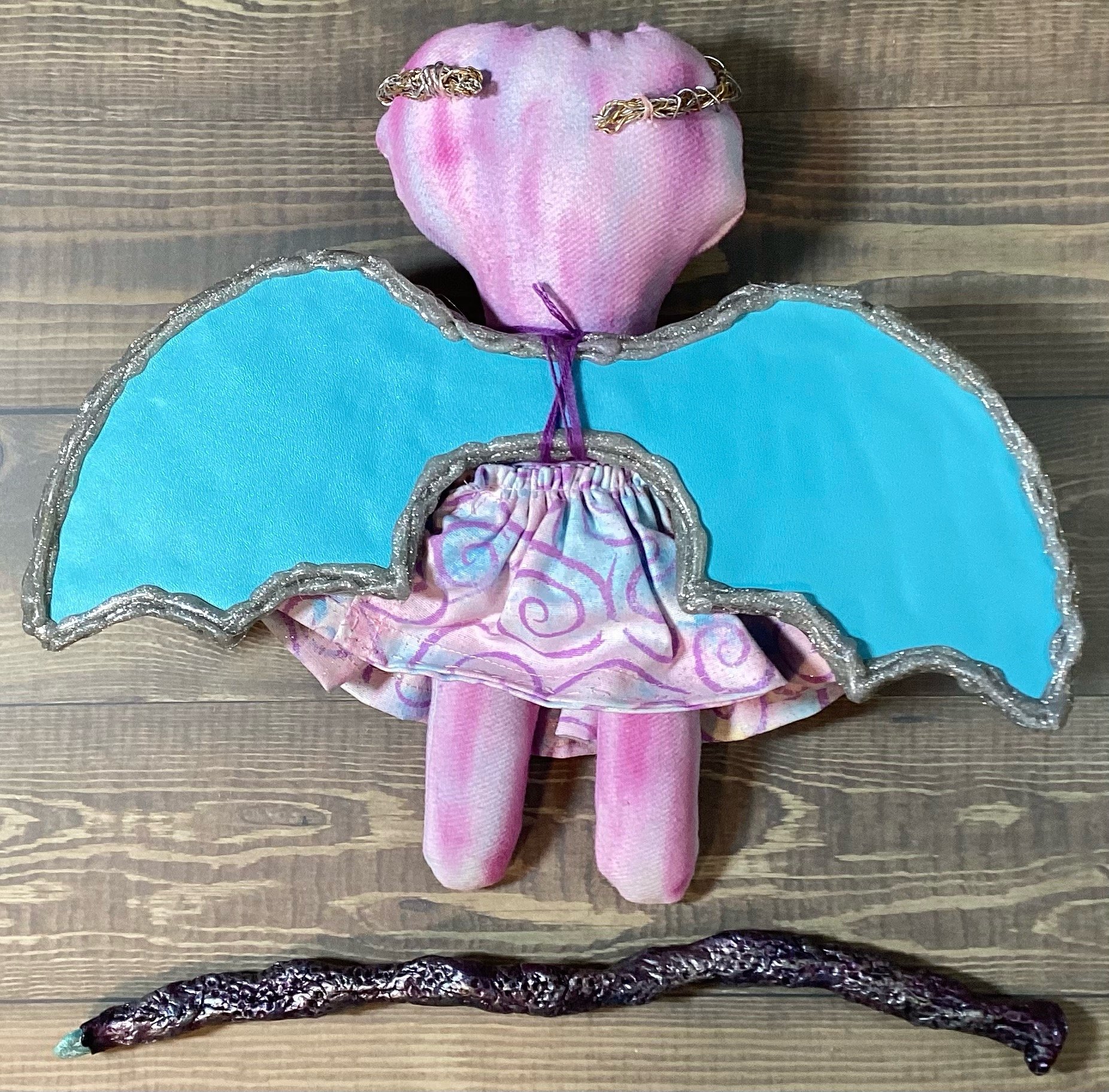 Her wings are made with two pieces of fabric hot glued together with a stabilizer in between and hot glue all around. Her skirt is cotton with a decorative necklace to match. She is wearing a wire wrapped head piece that has a charm woven into it.