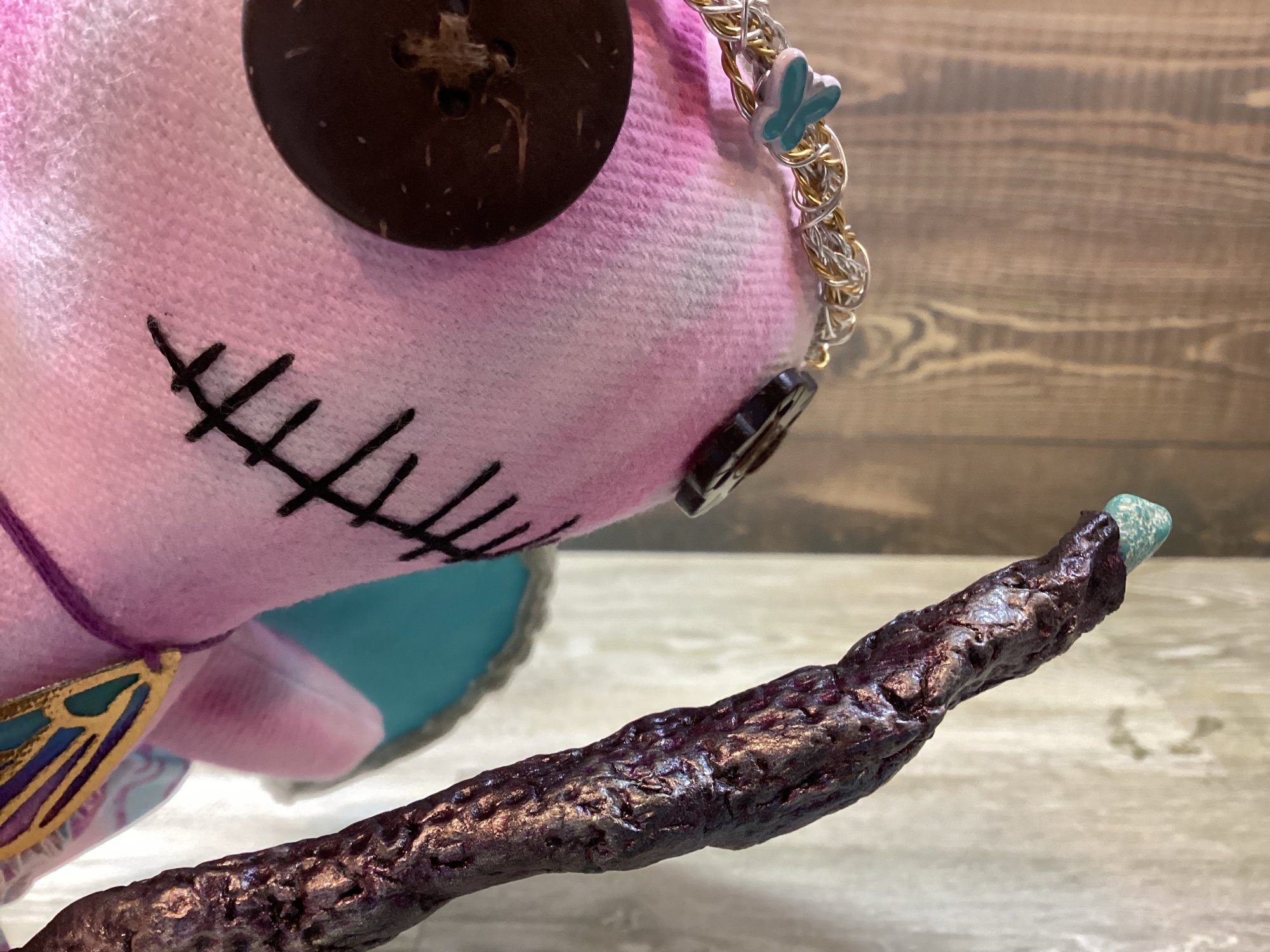 Her wand is handmade using air drying clay and is hand painted. The wand is her gift to you, to help you on your journey. The stone on the top of the wand is an Amazonite. The stone has been saged and has intentions in it to help you on your spiritual journey.