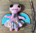 She is made from cotton fabric that I color with pastels. She is firmly stuffed with fiberfill and will sit with some support with her wings. Her eyes are buttons and her mouth is sewn on with embroidery floss.