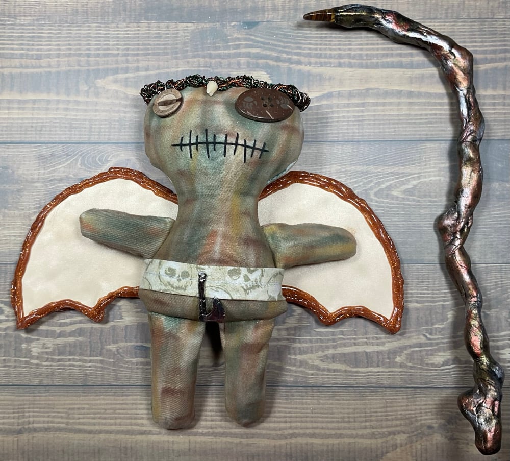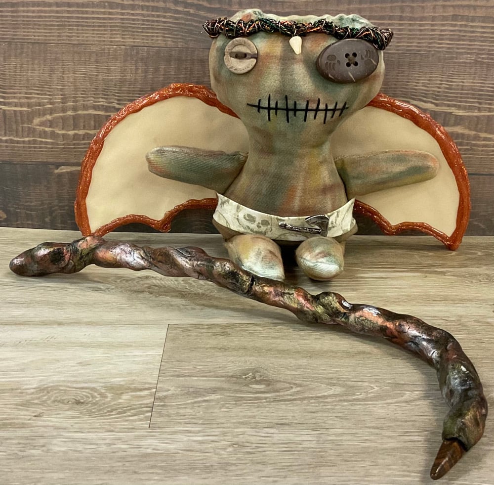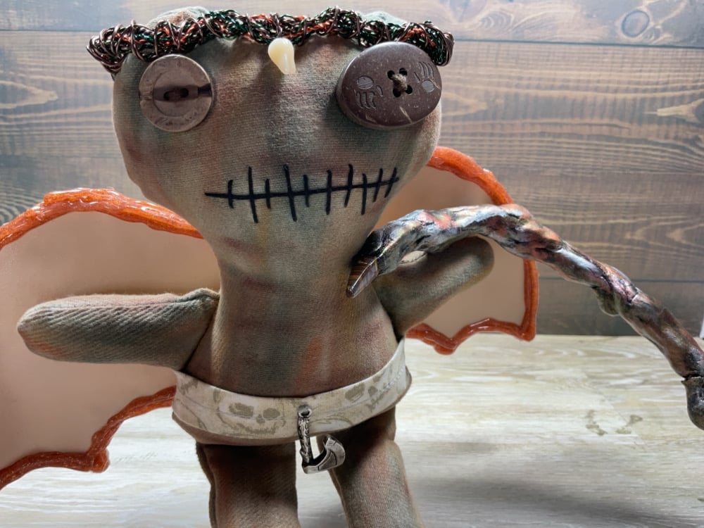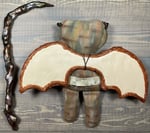 His wings are made with two pieces of fabric hot glued together with a stabilizer in between and hot glue all around. His belt is cotton with a decorative belt buckle to match. He is wearing a wire wrapped head piece that has a charm woven into it.