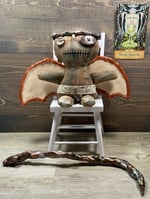 He is made from cotton fabric that I color with pastels. He is firmly stuffed with fiberfill and will sit with some support with his wings. His eyes are buttons and his mouth is sewn on with embroidery floss.