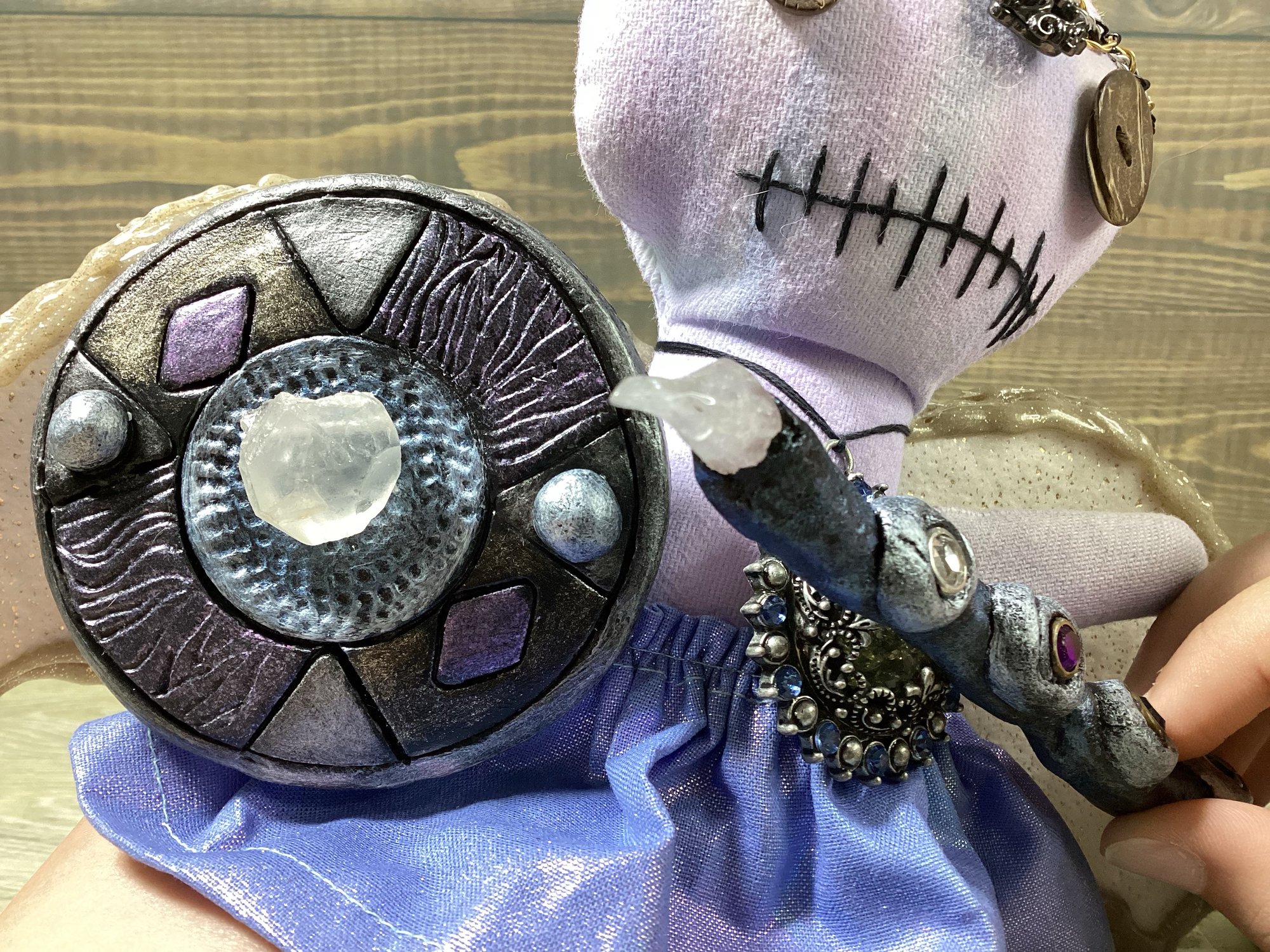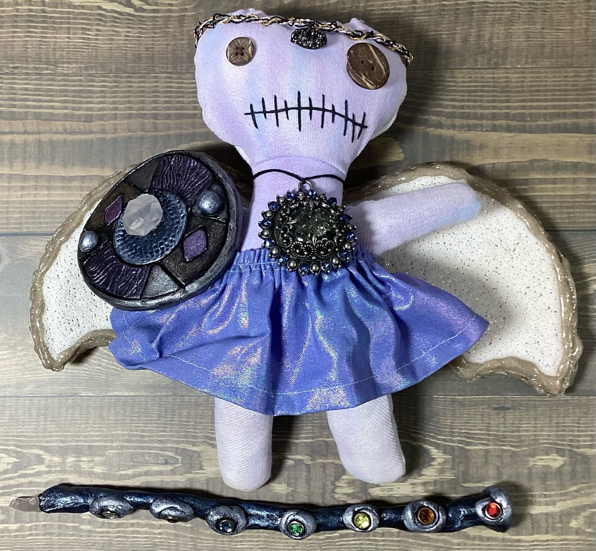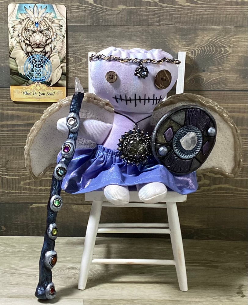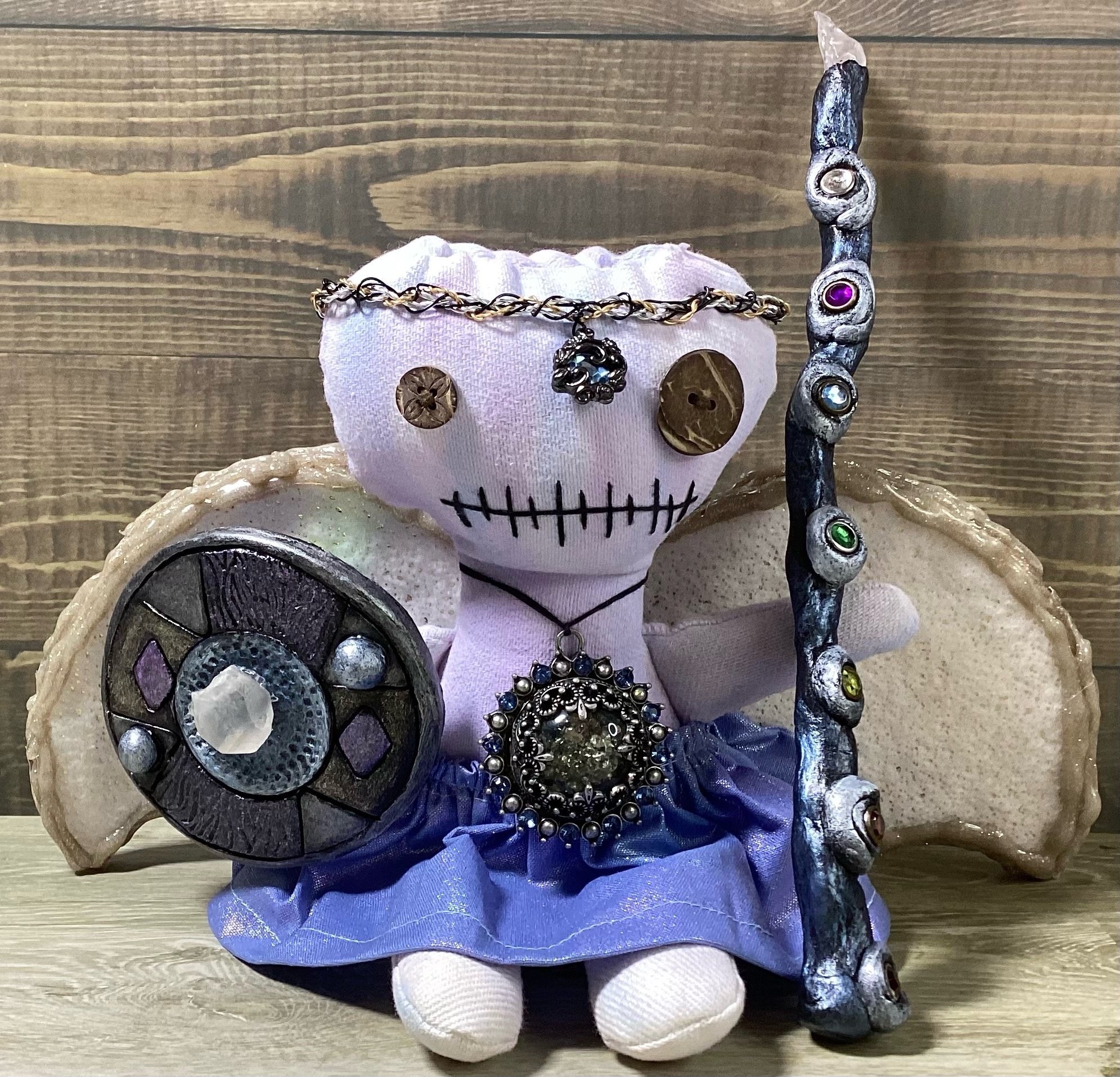 Her shield and wand are both handmade using air drying clay and are hand painted. The shield can be taken off her arm or can be placed next to her. The wand is her gift to you, to help you on your journey. The stone in the middle of the shield is a Clear Topaz and the stone on the top of the wand is the Super 7 Stone with jewels that represent the 7 Chakras going down it. Both stones have been saged and both have intentions in them to help you on your spiritual journey.