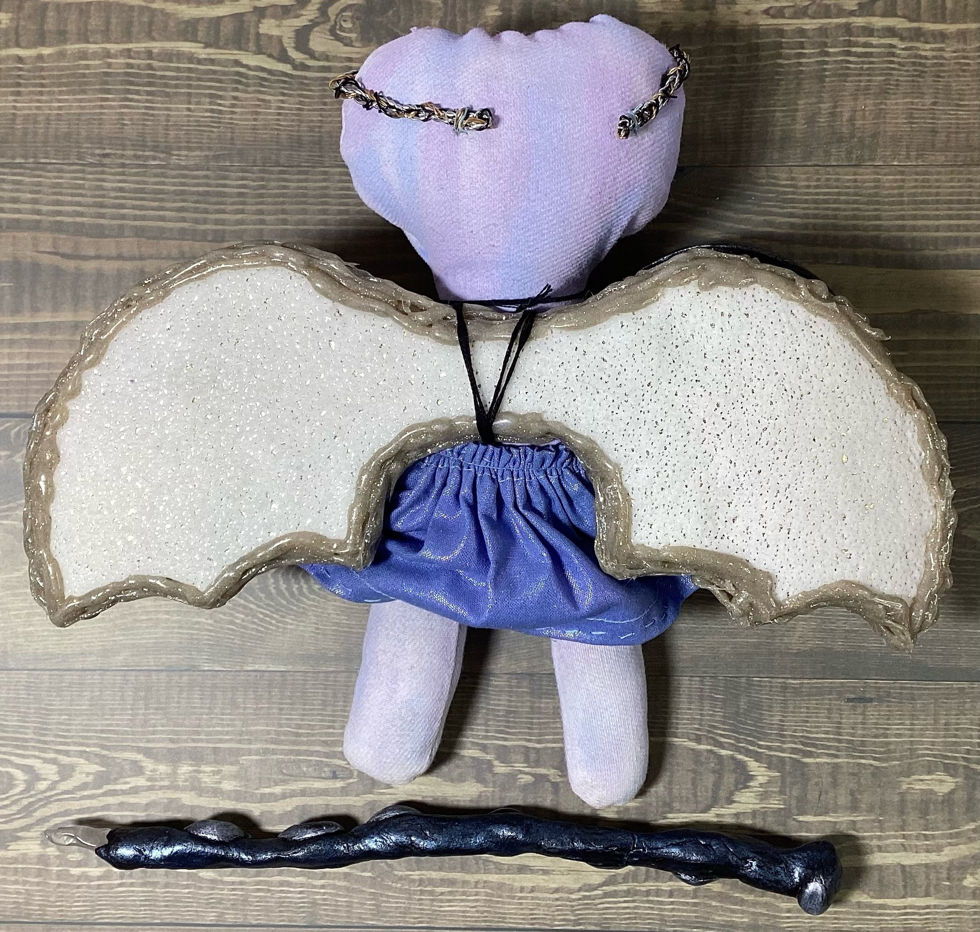 Her wings are made with two pieces of fabric hot glued together with a stabilizer in between and hot glue all around. Her skirt is cotton with a decorative necklace to match. She is wearing a wire wrapped head piece that has a charm woven into it.
