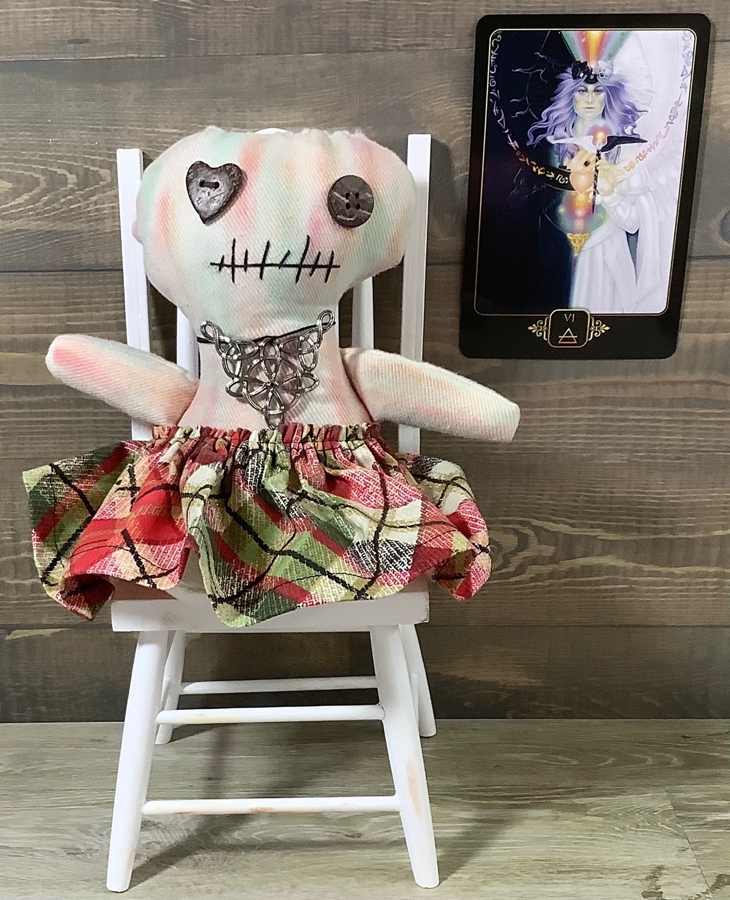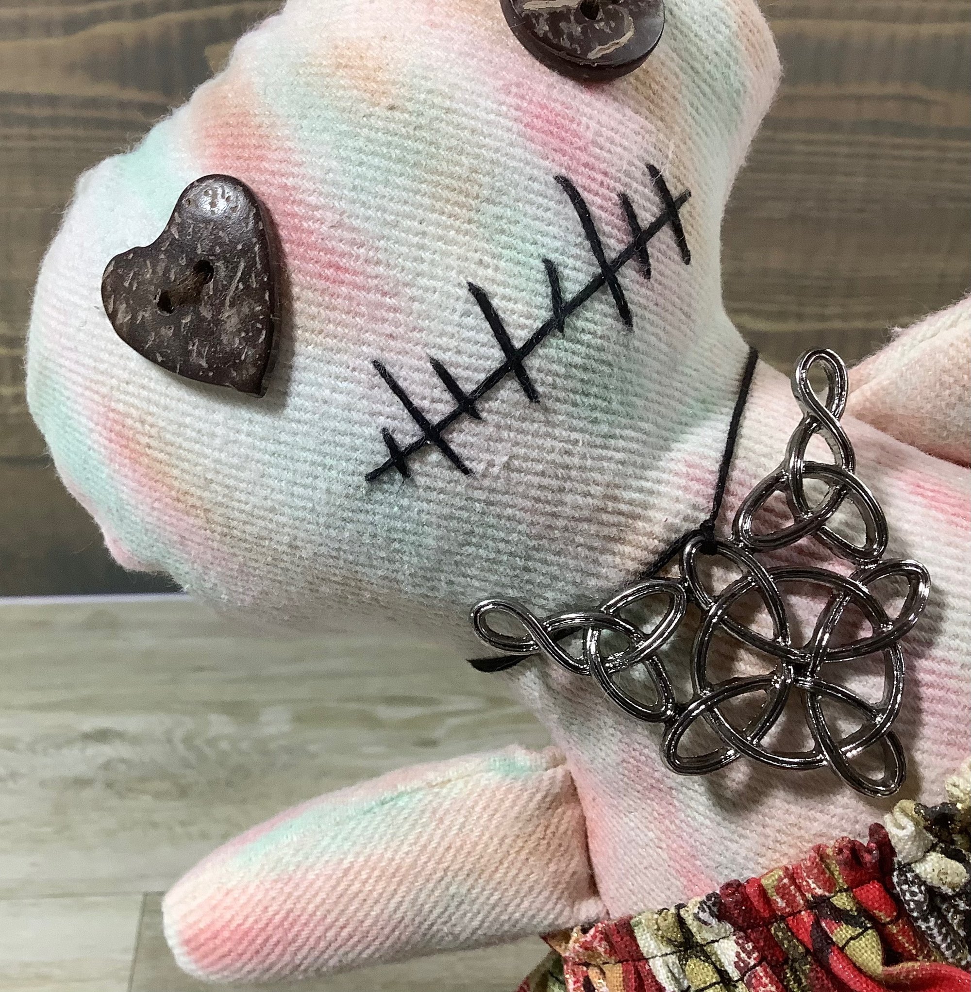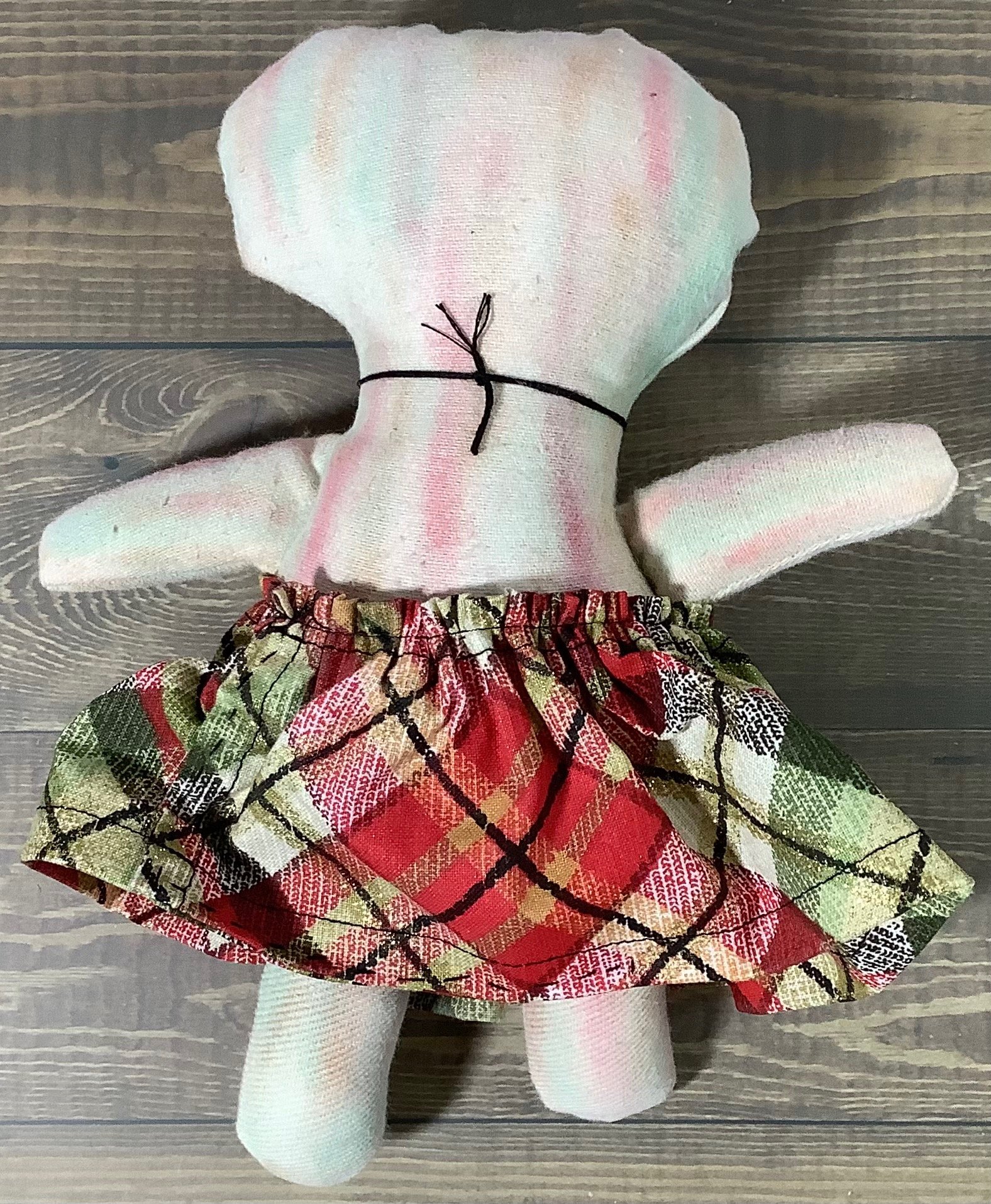 She is made from cotton fabric that I color with pastels. She is firmly stuffed with fiberfill and will sit with some support. Her eyes are buttons and her mouth is sewn on with embroidery floss. Her skirt is cotton with a decorative necklace to match.