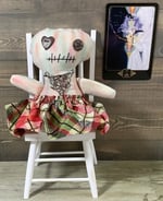 NOT INTENDED FOR CHILDREN! She has buttons and small parts that could easily be eaten. She is intended for decoration only. She will NOT stand up to rough play and can’t be machine washed.