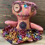 NOT INTENDED FOR CHILDREN! She has buttons and small parts that could easily be eaten. She is intended for decoration only. She will NOT stand up to rough play and can’t be machine washed.