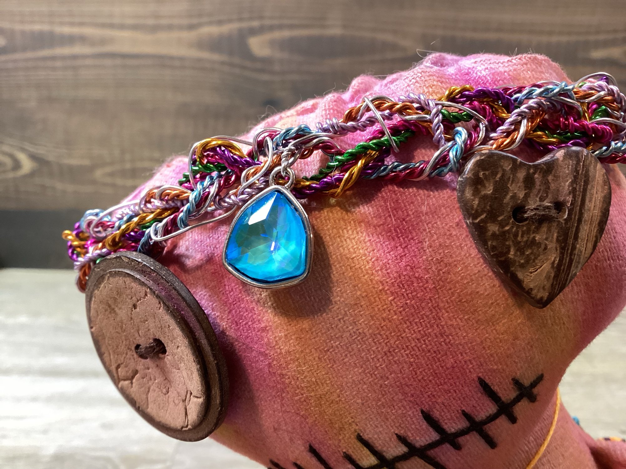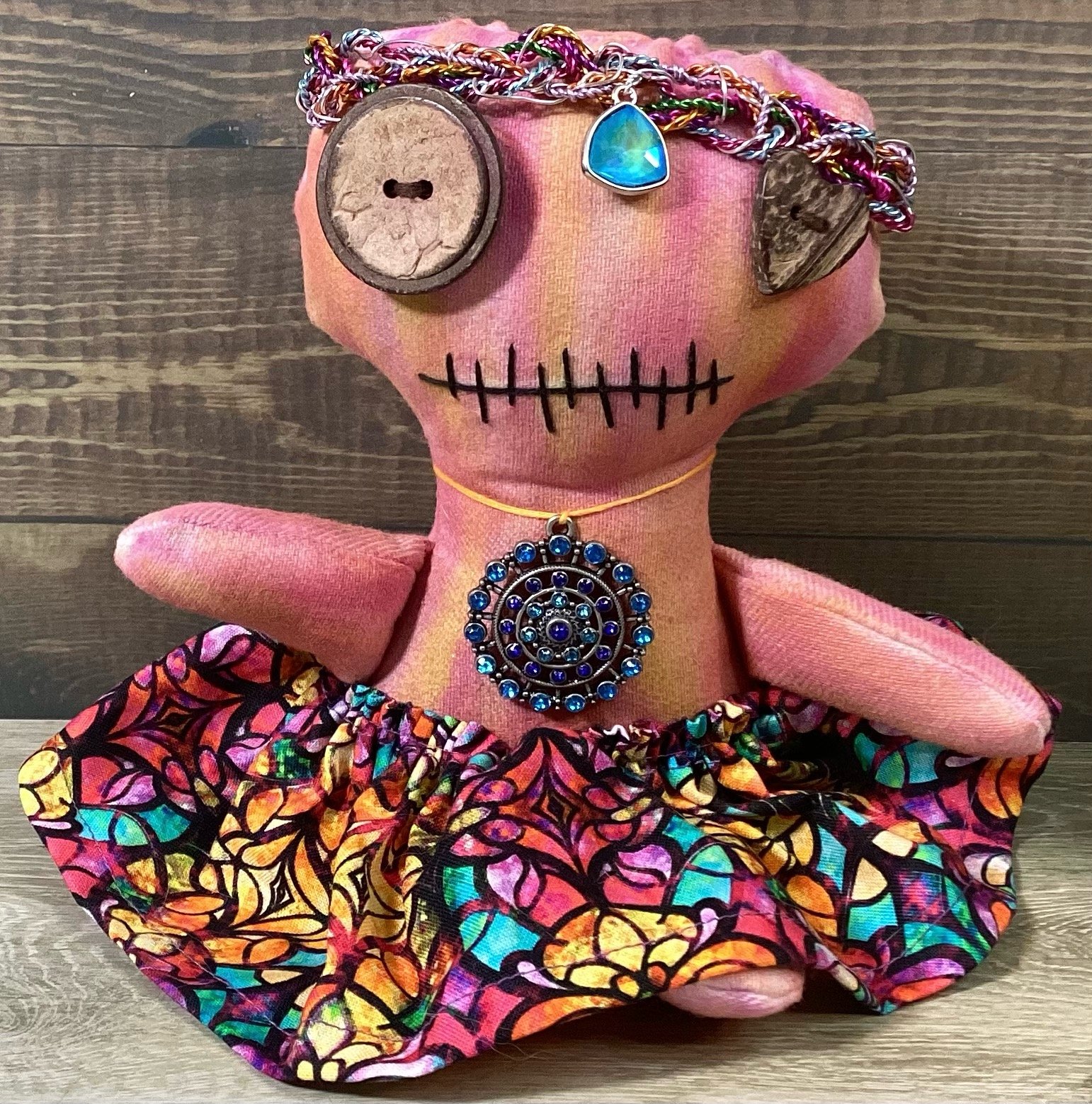 She is made from cotton fabric that I color with pastels. She is firmly stuffed with fiberfill and will sit with some support. Her eyes are buttons and her mouth is sewn on with embroidery floss. Her skirt is cotton with a decorative necklace to match. She is wearing a wire wrapped head piece that has a charm woven into it.