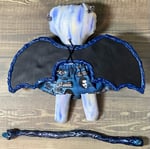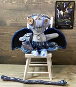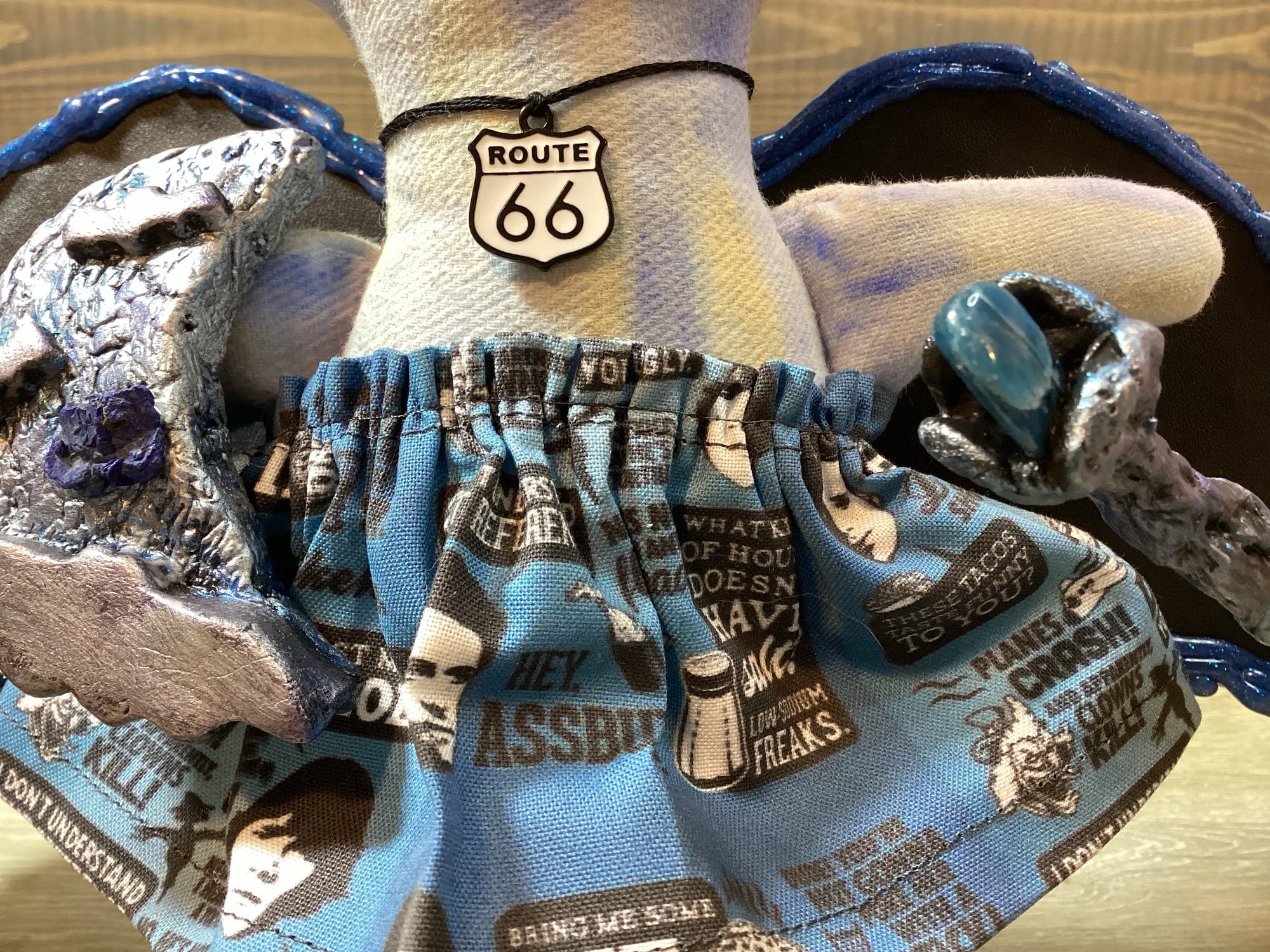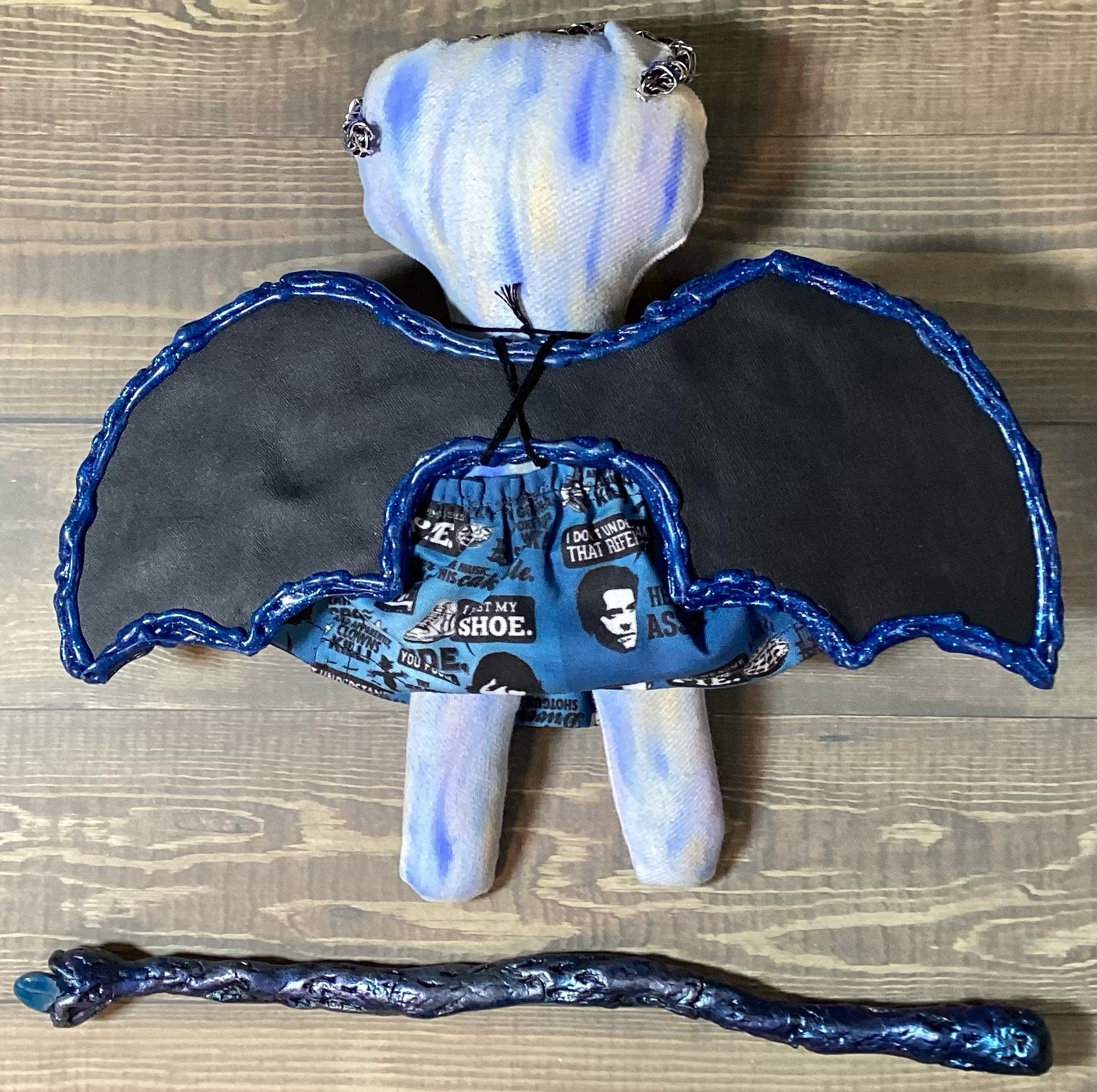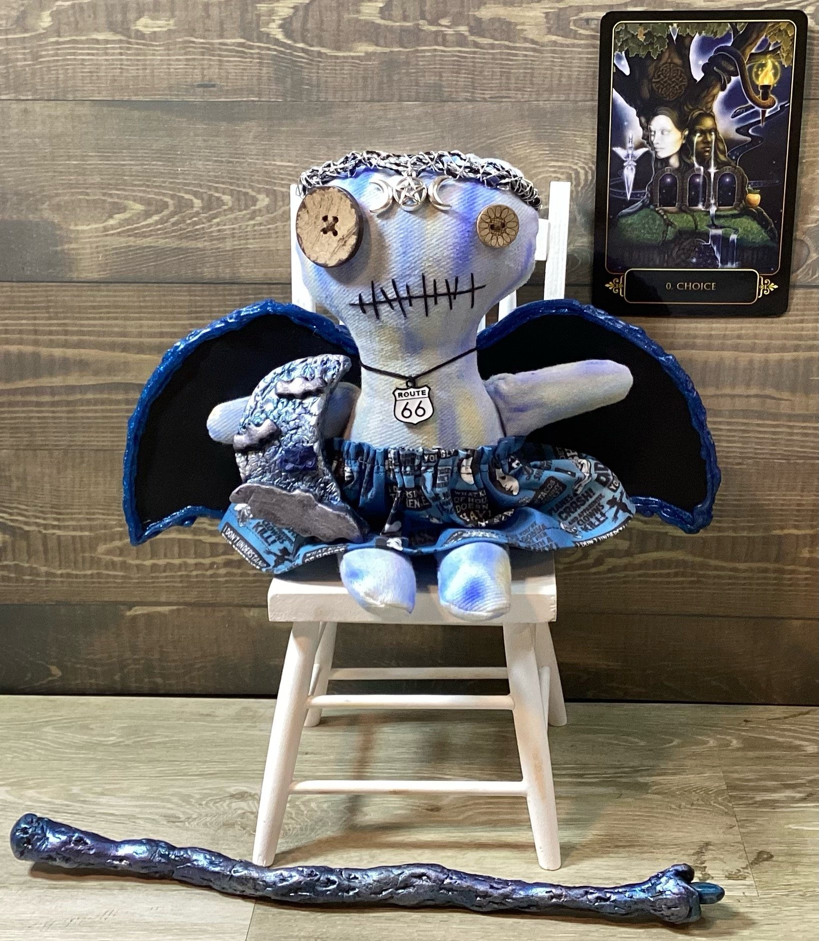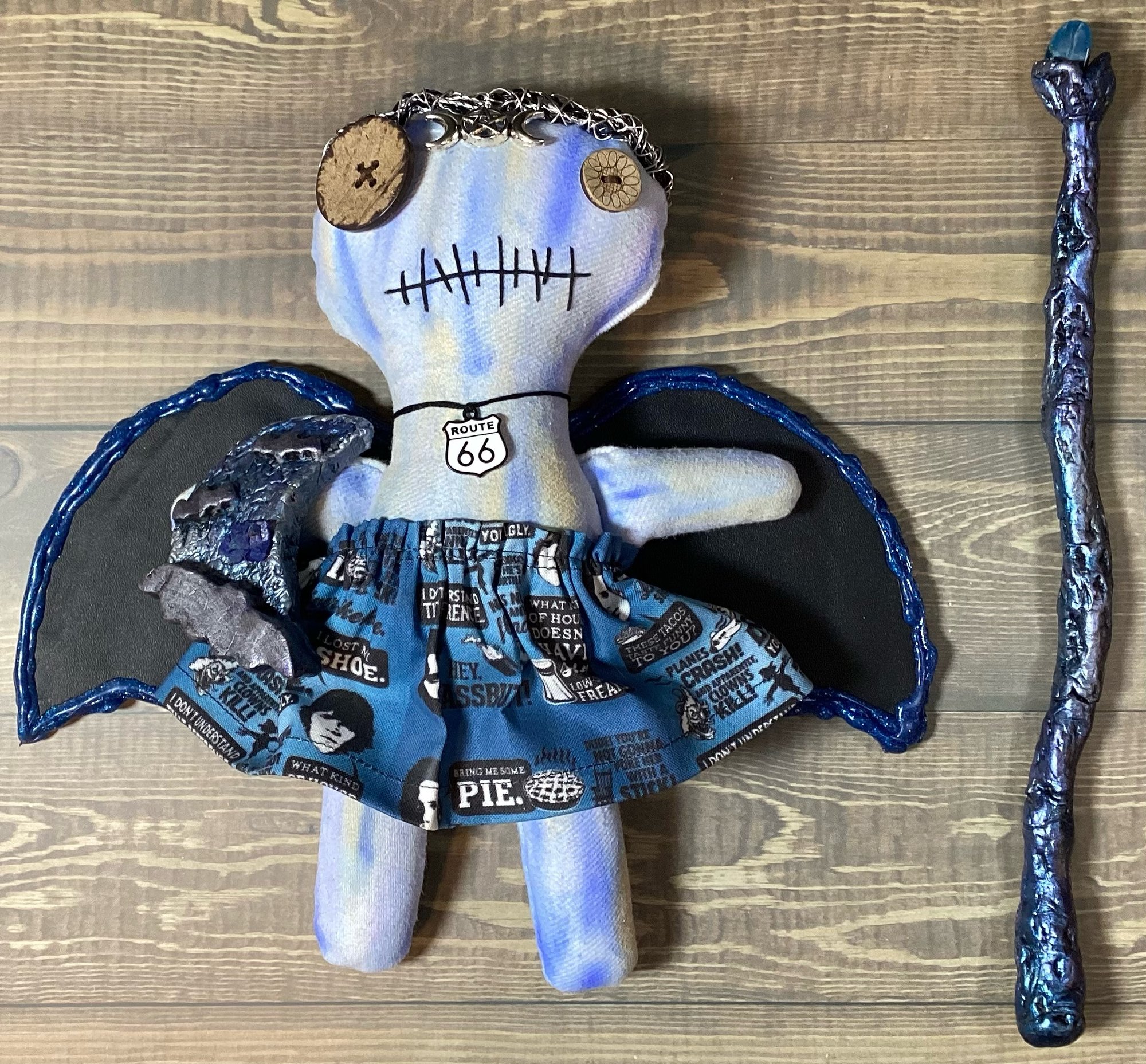 Her shield and wand are both handmade using air drying clay and are hand painted. The shield can be taken off her arm or can be placed next to her. The wand is her gift to you, to help you on your journey. The stone by the big bat on the shield is an Azurite and the stone on the top of the wand is a Blue Apatite. Both stones have been saged and both have intentions in them to help you on your spiritual journey.