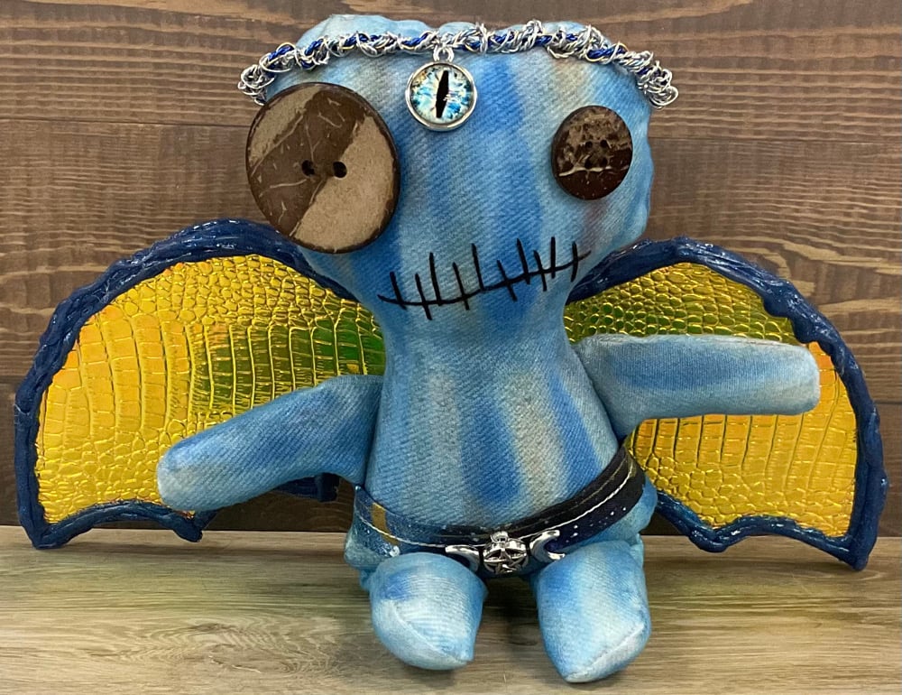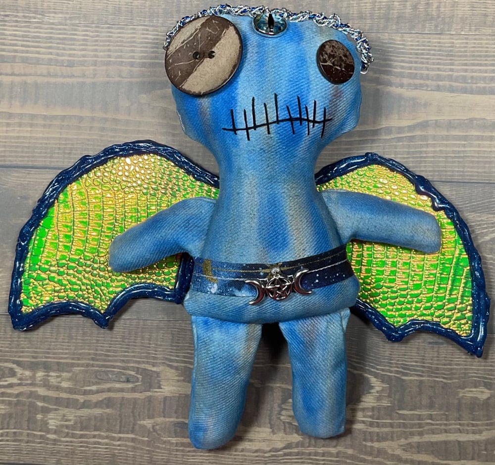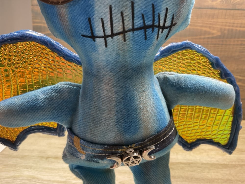 His wings are made with two pieces of fabric hot glued together with a stabilizer in between and hot glue all around. His belt is cotton with a decorative belt buckle to match. He is wearing a wire wrapped head piece that has a charm woven into it.