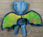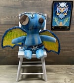 He is made from cotton fabric that I color with pastels. He is firmly stuffed with fiberfill and will sit with some support with his wings. His eyes are buttons and his mouth is sewn on with embroidery floss.