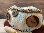 He is made from cotton fabric that I color with pastels. He is firmly stuffed with fiberfill and will sit with some support with his wings. His eyes are buttons and his mouth is sewn on with embroidery floss.
