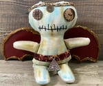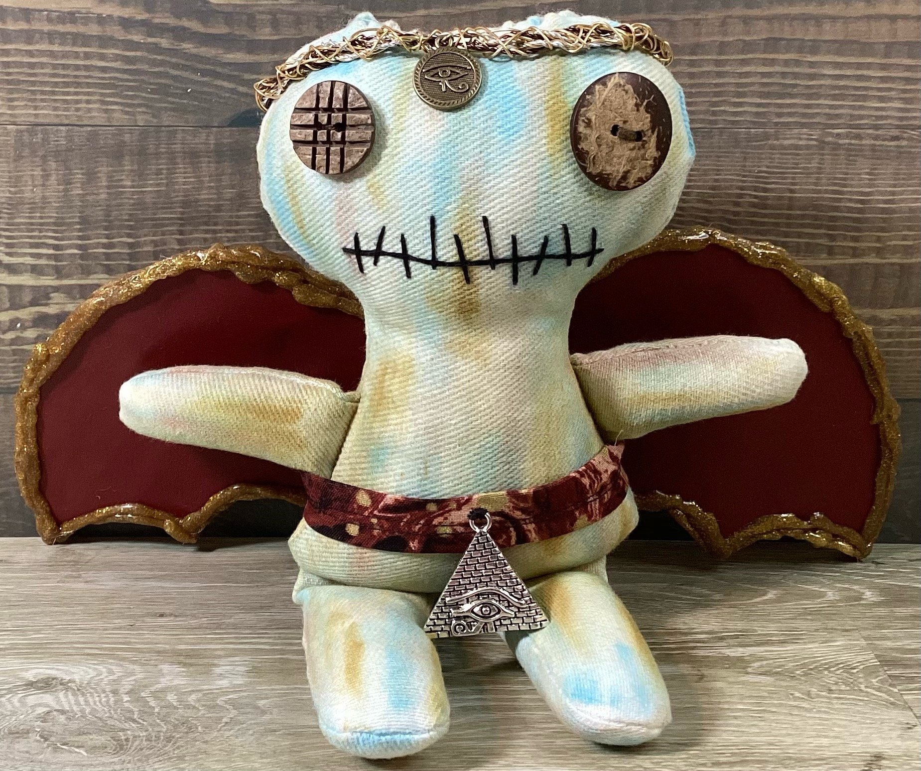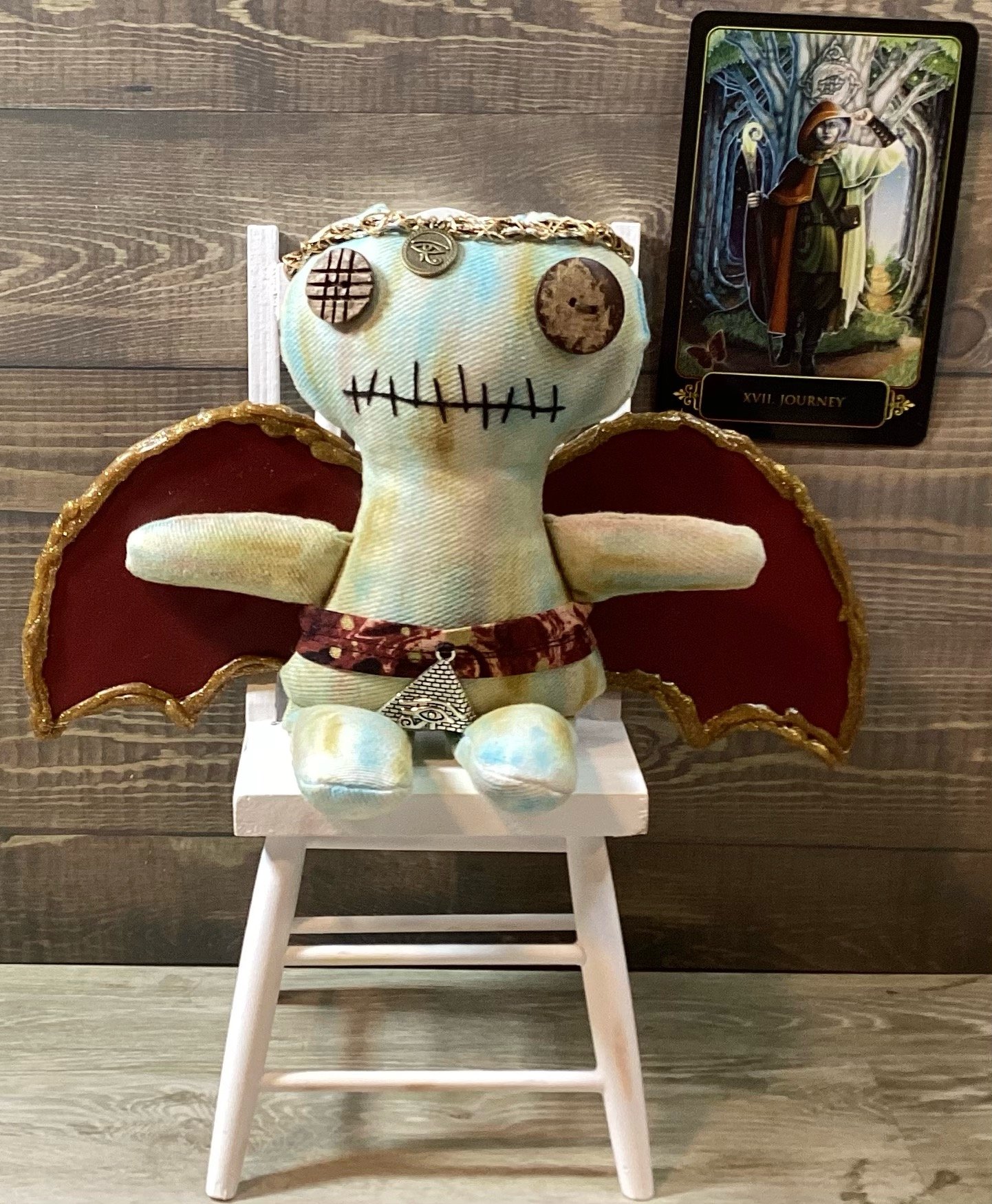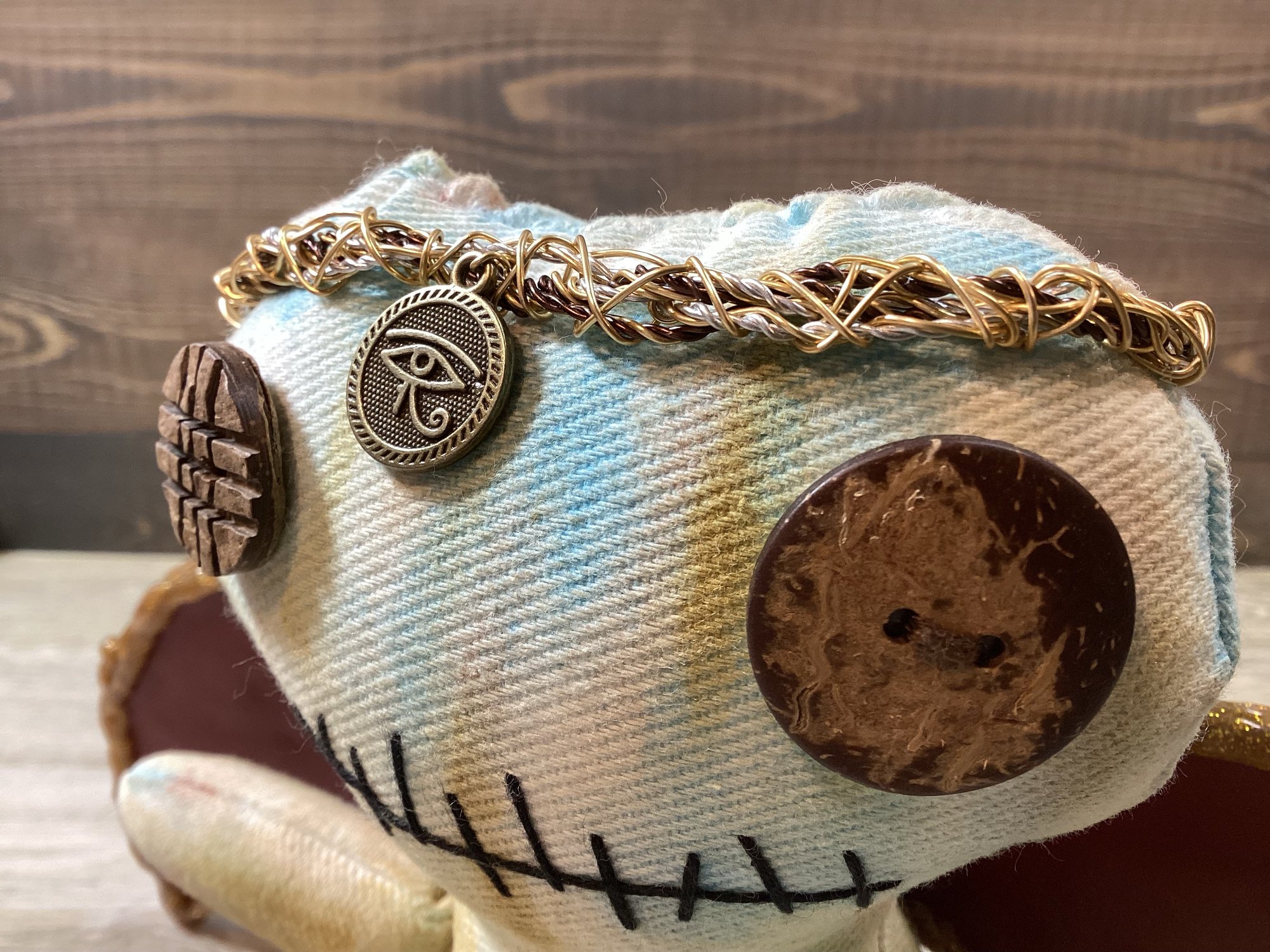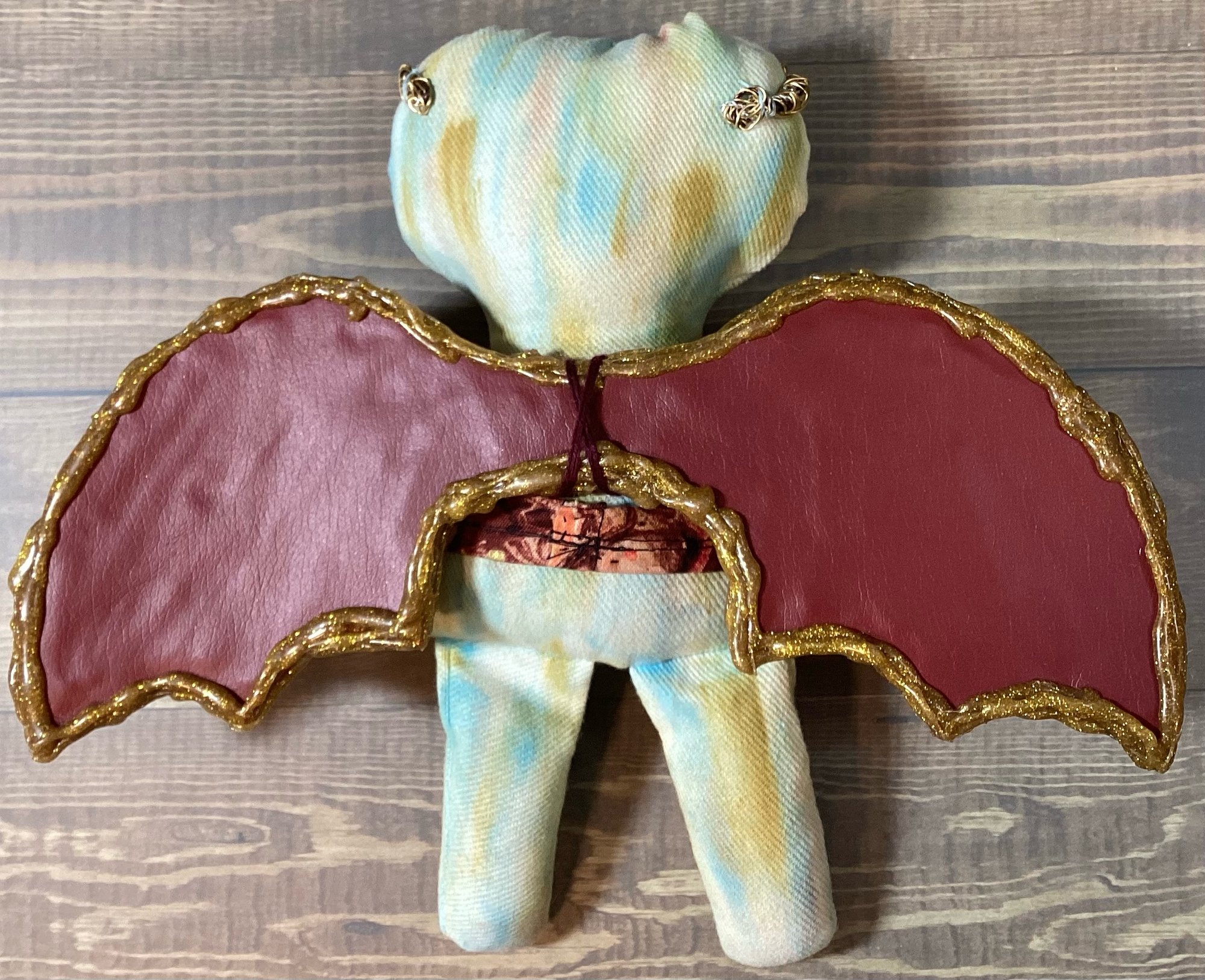 His wings are made with two pieces of fabric hot glued together with a stabilizer in between and hot glue all around. His belt is cotton with a decorative belt buckle to match. He is wearing a wire wrapped head piece that has a charm woven into it.