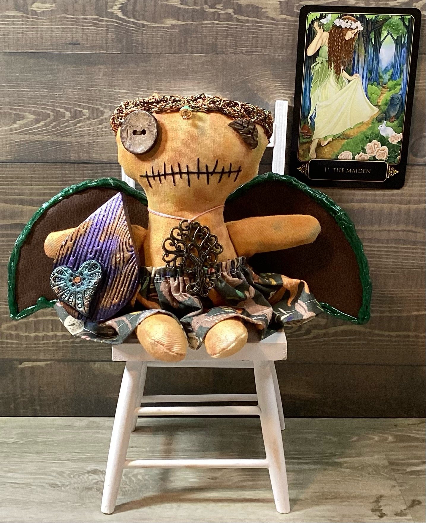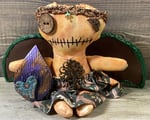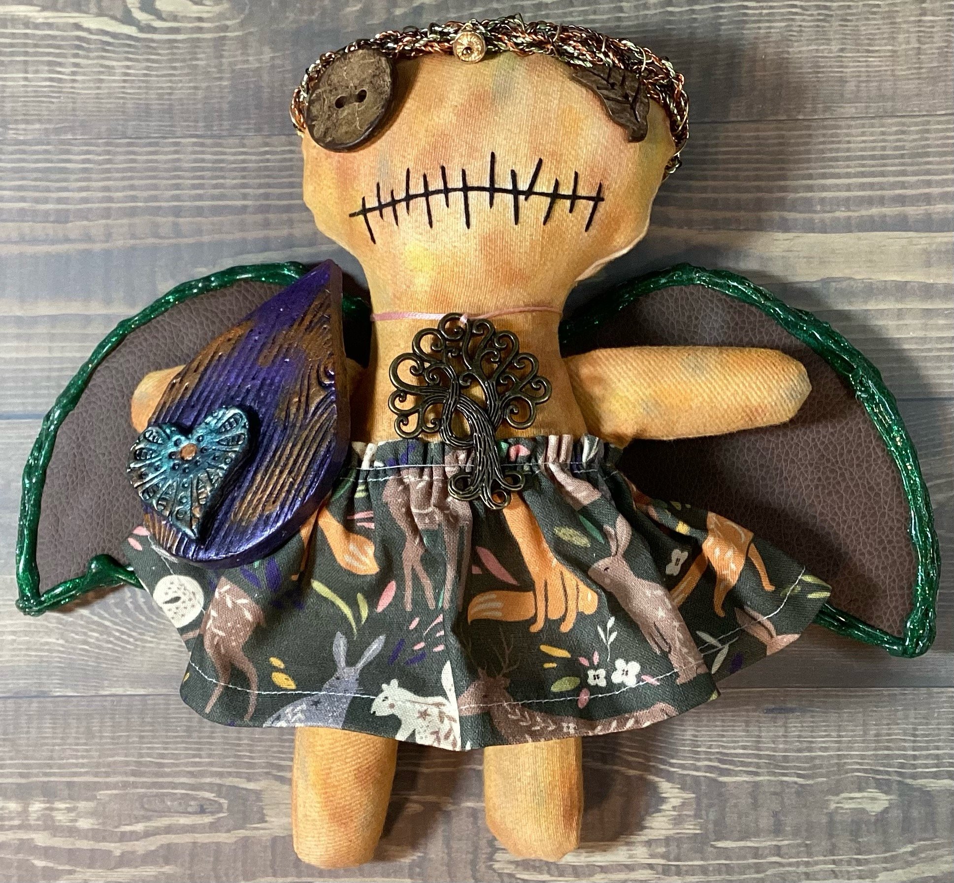 Her wings are made with two pieces of fabric hot glued together with a stabilizer in between and hot glue all around. Her skirt is cotton with a decorative necklace to match. She is wearing a wire wrapped head piece that has a charm woven into it.
