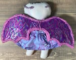 She is made from cotton fabric that I color with pastels. She is firmly stuffed with fiberfill and will sit with some support with her wings. Her eyes are buttons and her mouth is sewn on with embroidery floss.