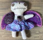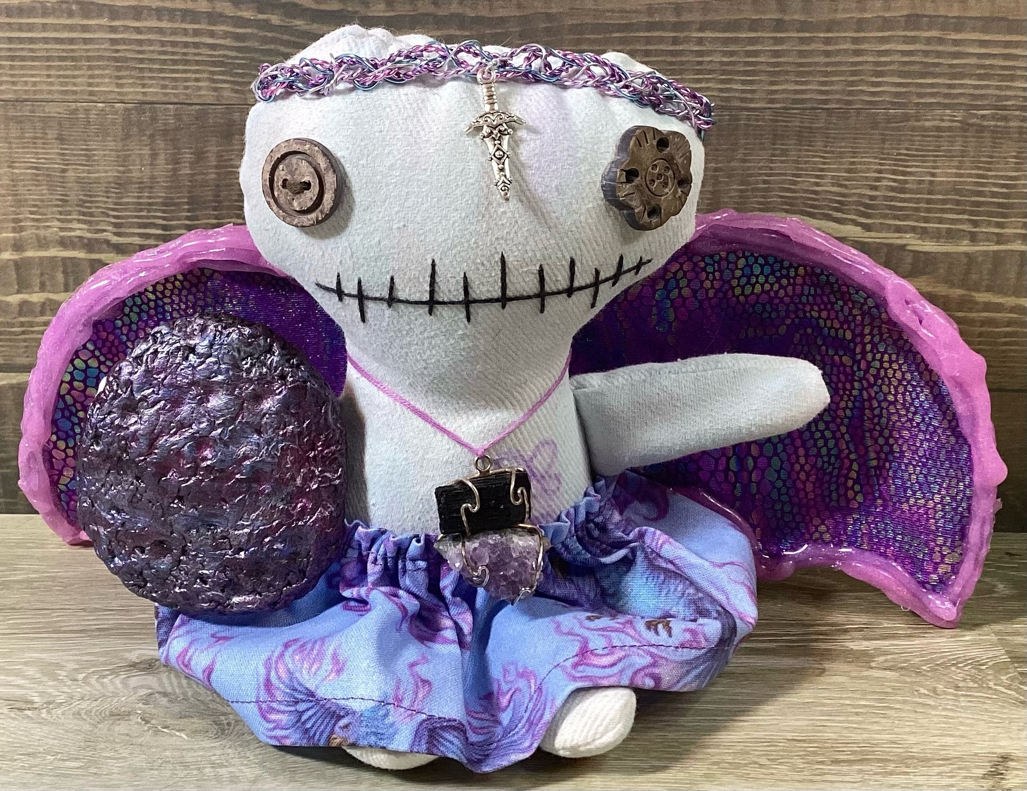 Her wings are made with two pieces of fabric hot glued together with a stabilizer in between and hot glue all around. Her skirt is cotton with a decorative necklace to match. She is wearing a wire wrapped head piece that has a charm woven into it.