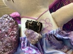 Her shield is handmade using air drying clay and is hand painted. The shield can be taken off her arm or can be placed next to her. The stones around her neck have been saged and but she wants you to add your intentions into them to help you on your spiritual journey.