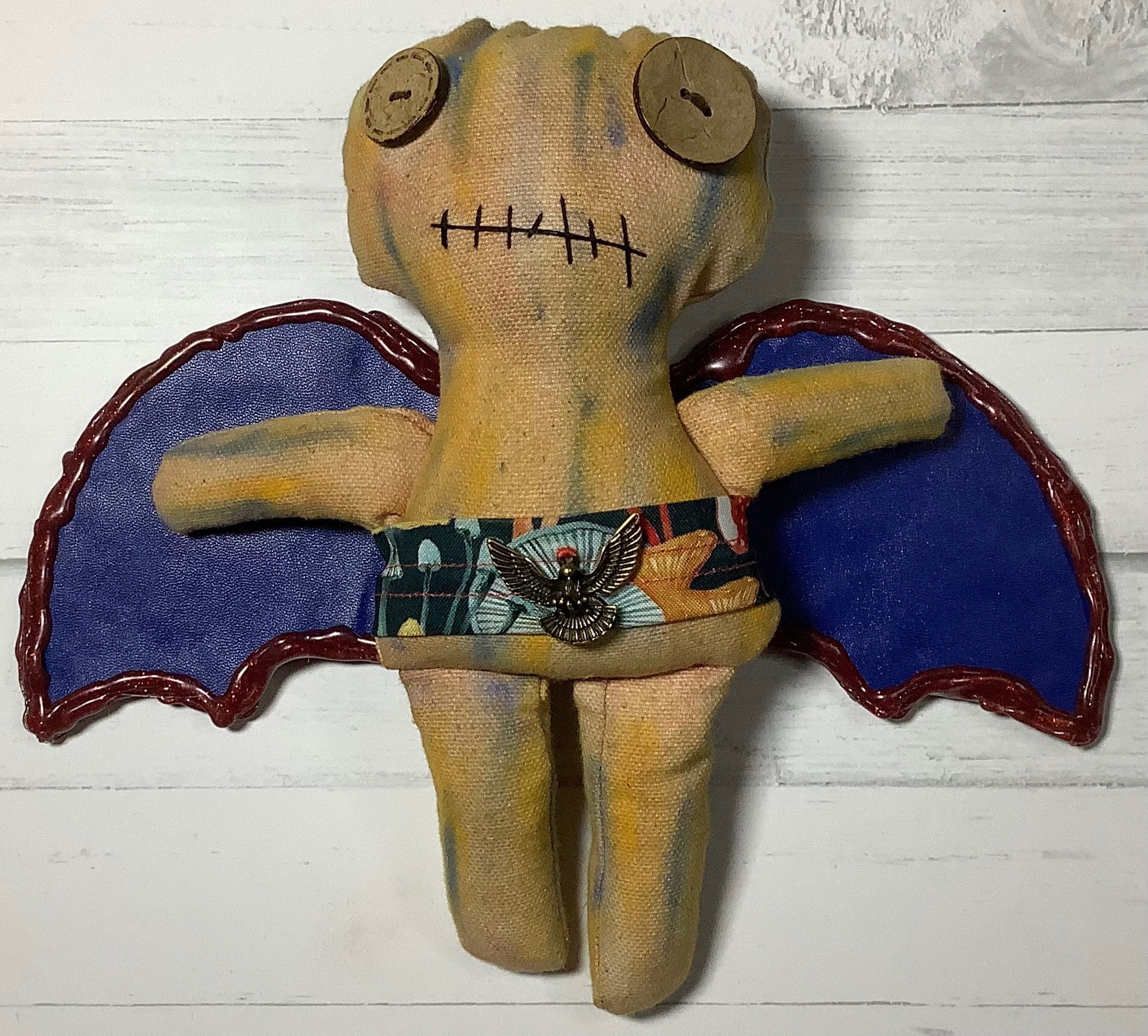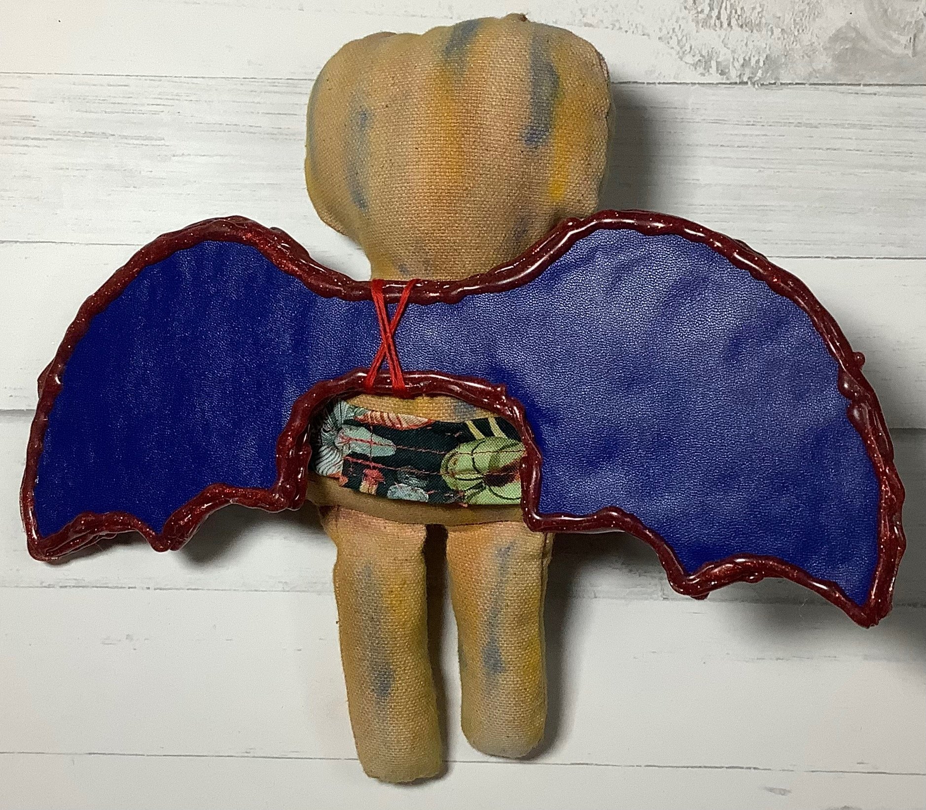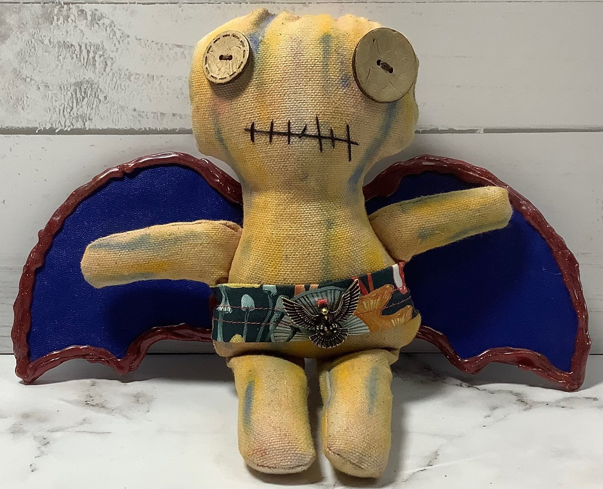 He is made from cotton fabric that I color with pastels. He is firmly stuffed with fiberfill and will sit with some support with his wings. His eyes are buttons and his mouth is sewn on with embroidery floss. His wings are made with two pieces of fabric hot glued together with a stabilizer in between and hot glue all around. His belt is cotton with a decorative belt buckle to match.