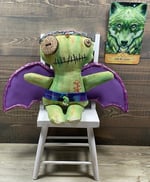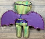 He is made from cotton fabric that I color with pastels. He is firmly stuffed with fiberfill and will sit with some support with his wings. His eyes are buttons and his mouth is sewn on with embroidery floss.