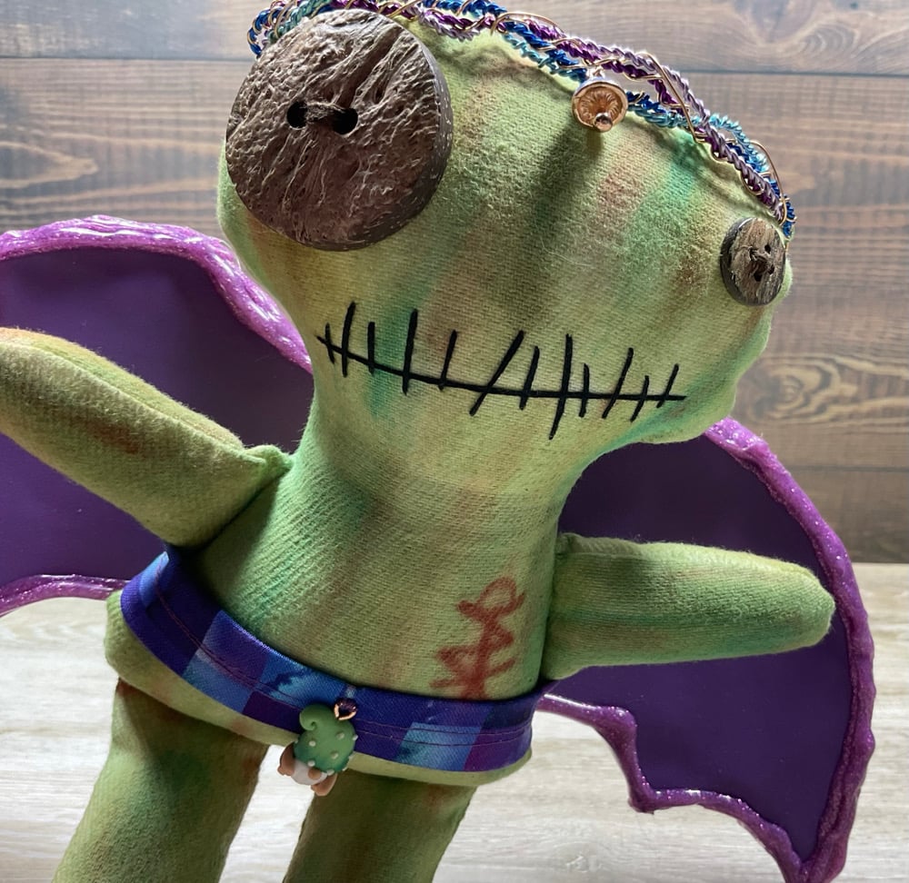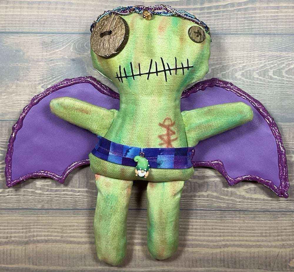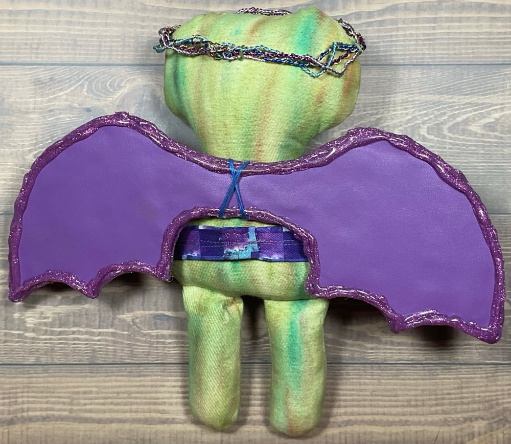 His wings are made with two pieces of fabric hot glued together with a stabilizer in between and hot glue all around. His belt is cotton with a decorative belt buckle to match. He is wearing a wire wrapped head piece that has a charm woven into it.