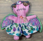 She is made from cotton fabric that I color with pastels. She is firmly stuffed with fiberfill and will sit with some support with her wings. Her eyes are buttons and her mouth is sewn on with embroidery floss.
