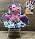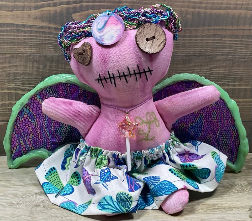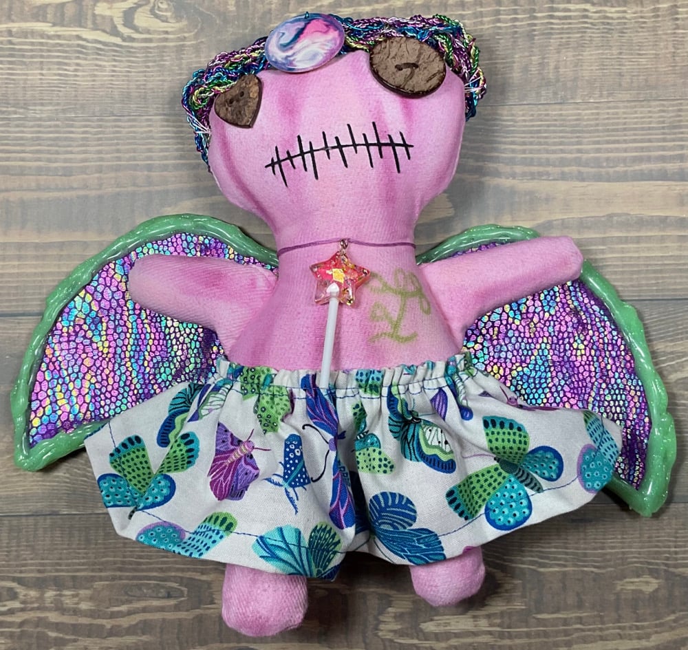 Her wings are made with two pieces of fabric hot glued together with a stabilizer in between and hot glue all around. Her skirt is cotton with a decorative necklace to match. She is wearing a wire wrapped head piece that has a charm woven into it.