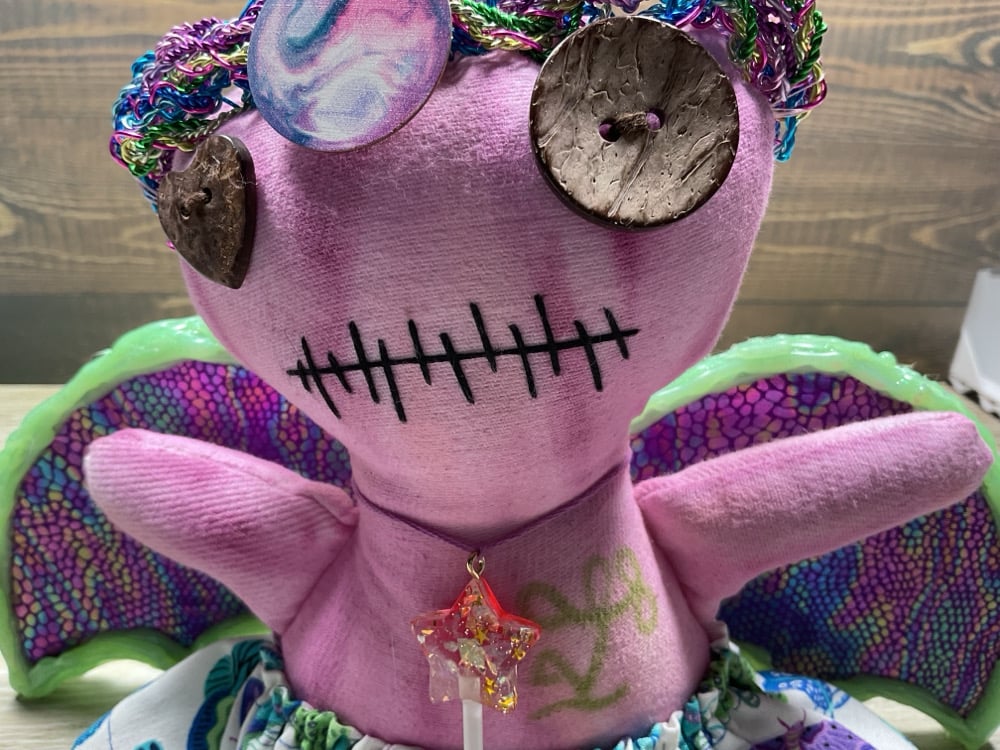 NOT INTENDED FOR CHILDREN! She has buttons and small parts that could easily be eaten. She is intended for decoration only. She will NOT stand up to rough play and can’t be machine washed.