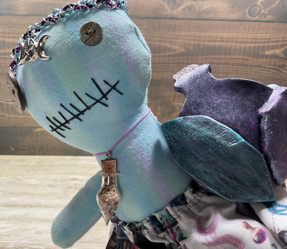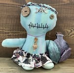 NOT INTENDED FOR CHILDREN! She has buttons and small parts that could easily be eaten. She is intended for decoration only. She will NOT stand up to rough play and can’t be machine washed.