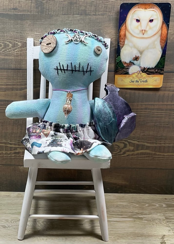 Her skirt is cotton with a decorative necklace to match. She is wearing a wire wrapped head piece that has a charm woven into it.