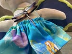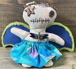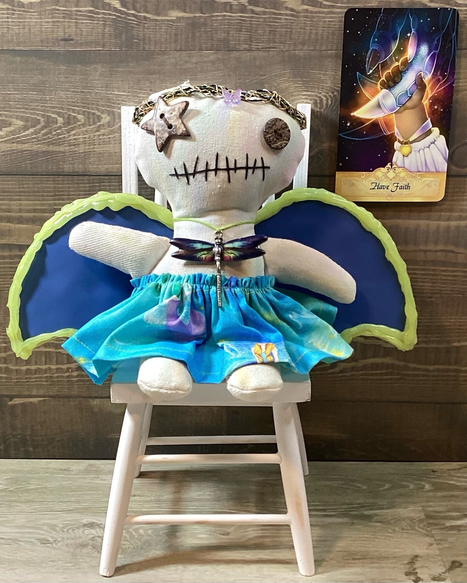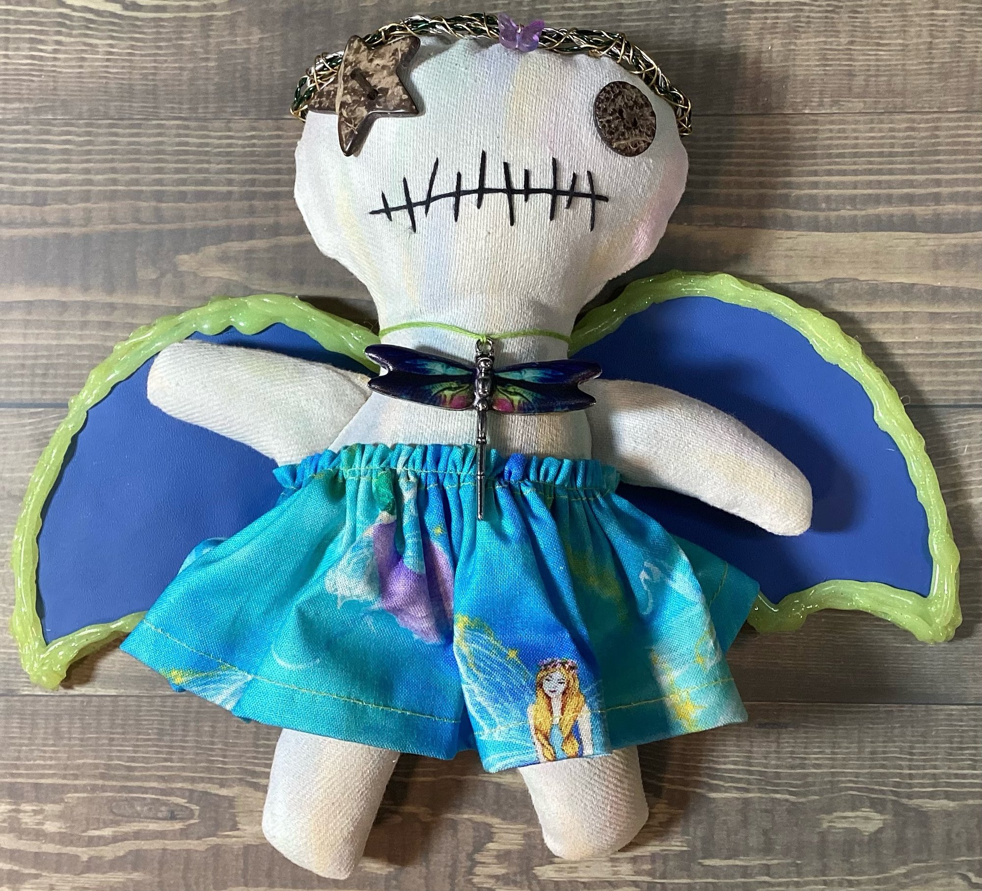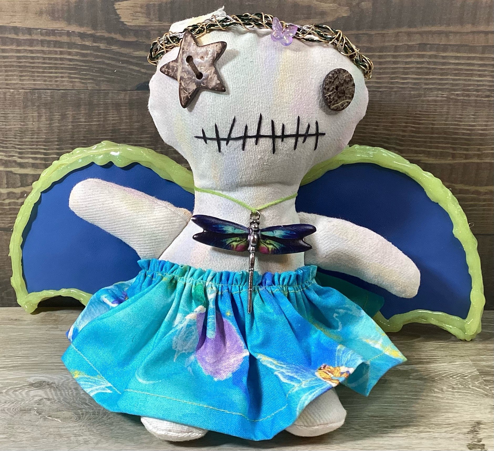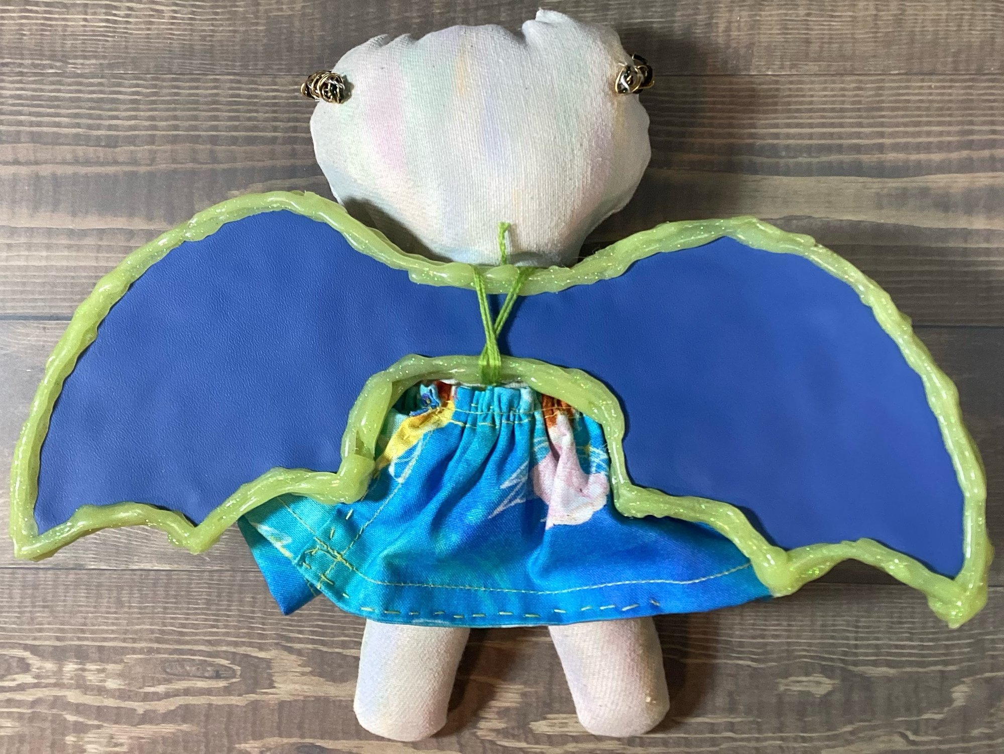 Her wings are made with two pieces of fabric hot glued together with a stabilizer in between and hot glue all around. Her skirt is cotton with a decorative necklace to match. She is wearing a wire wrapped head piece that has a charm woven into it.