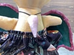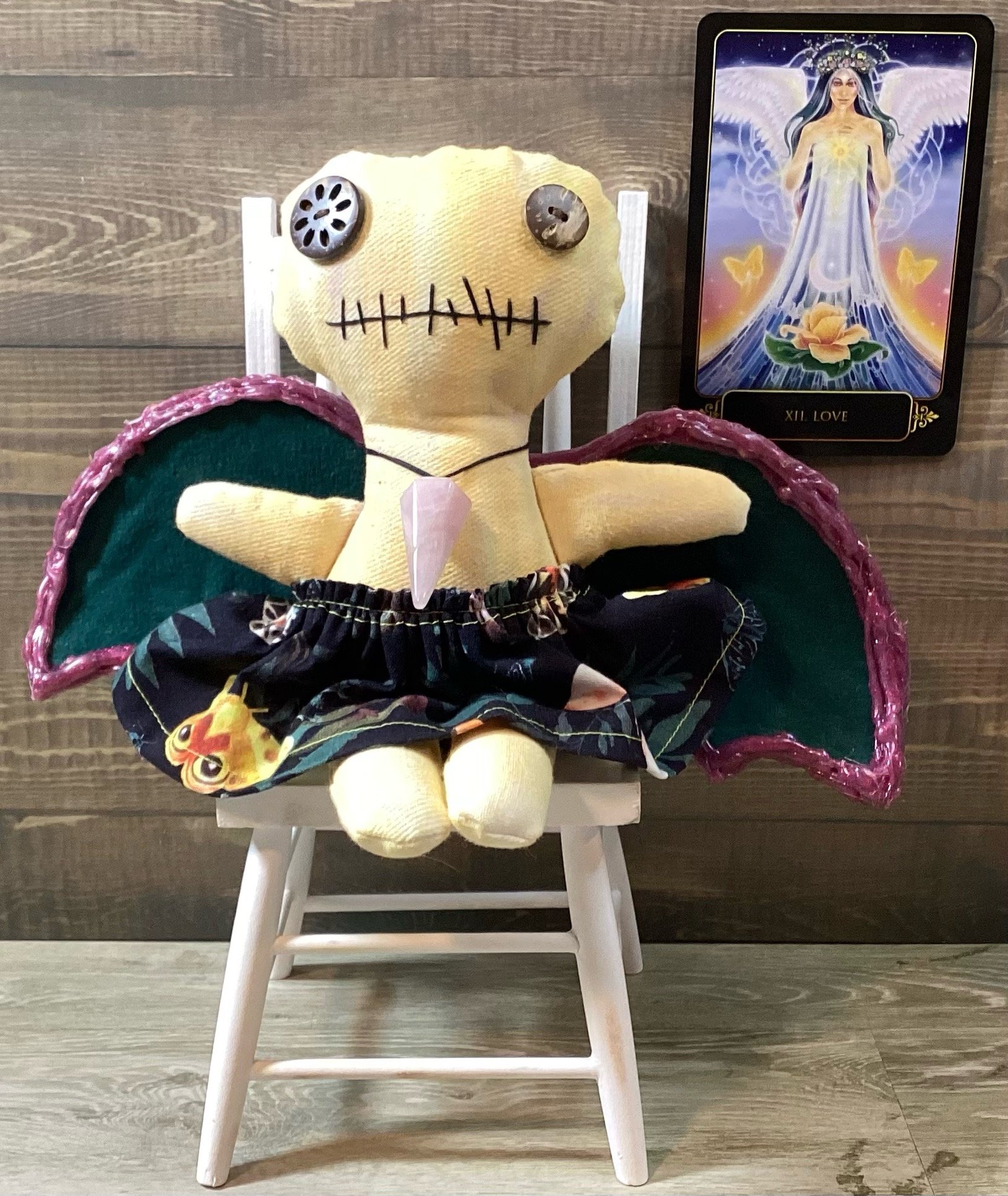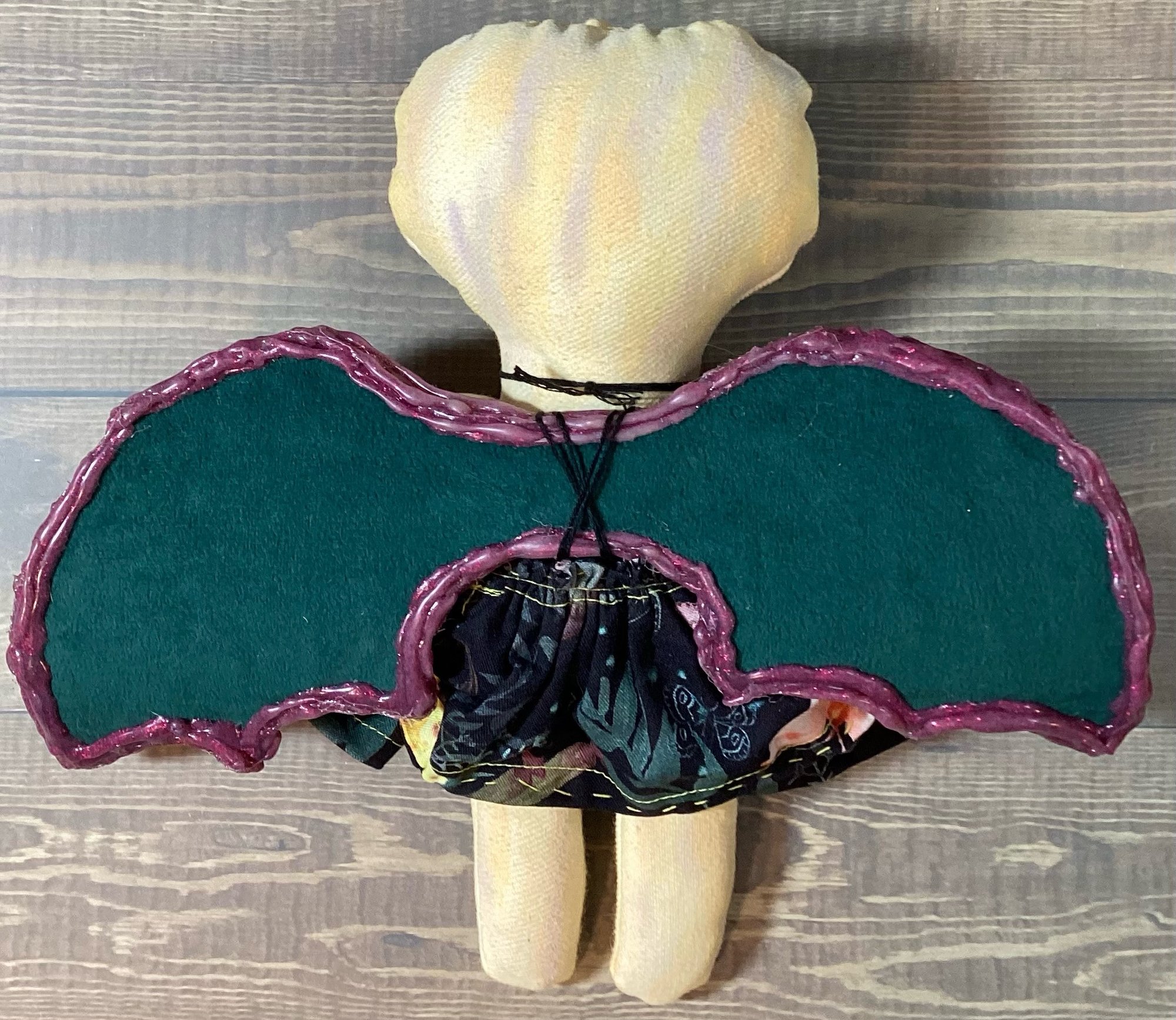 She is made from cotton fabric that I color with pastels. She is firmly stuffed with fiberfill and will sit with some support with her wings. Her eyes are buttons and her mouth is sewn on with embroidery floss. Her wings are made with two pieces of fabric hot glued together with a stabilizer in between and hot glue all around. Her skirt is cotton with a decorative necklace to match.