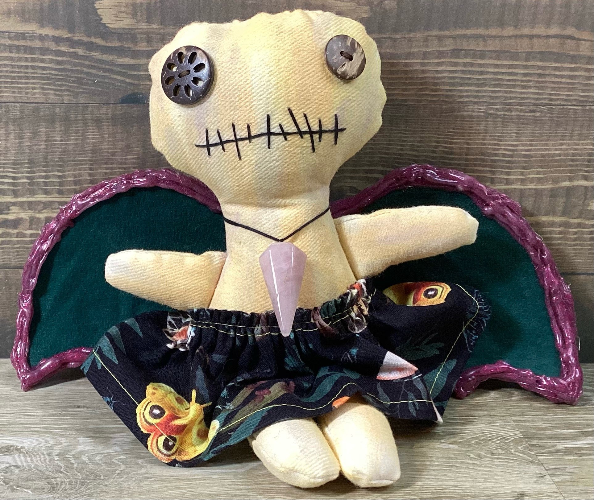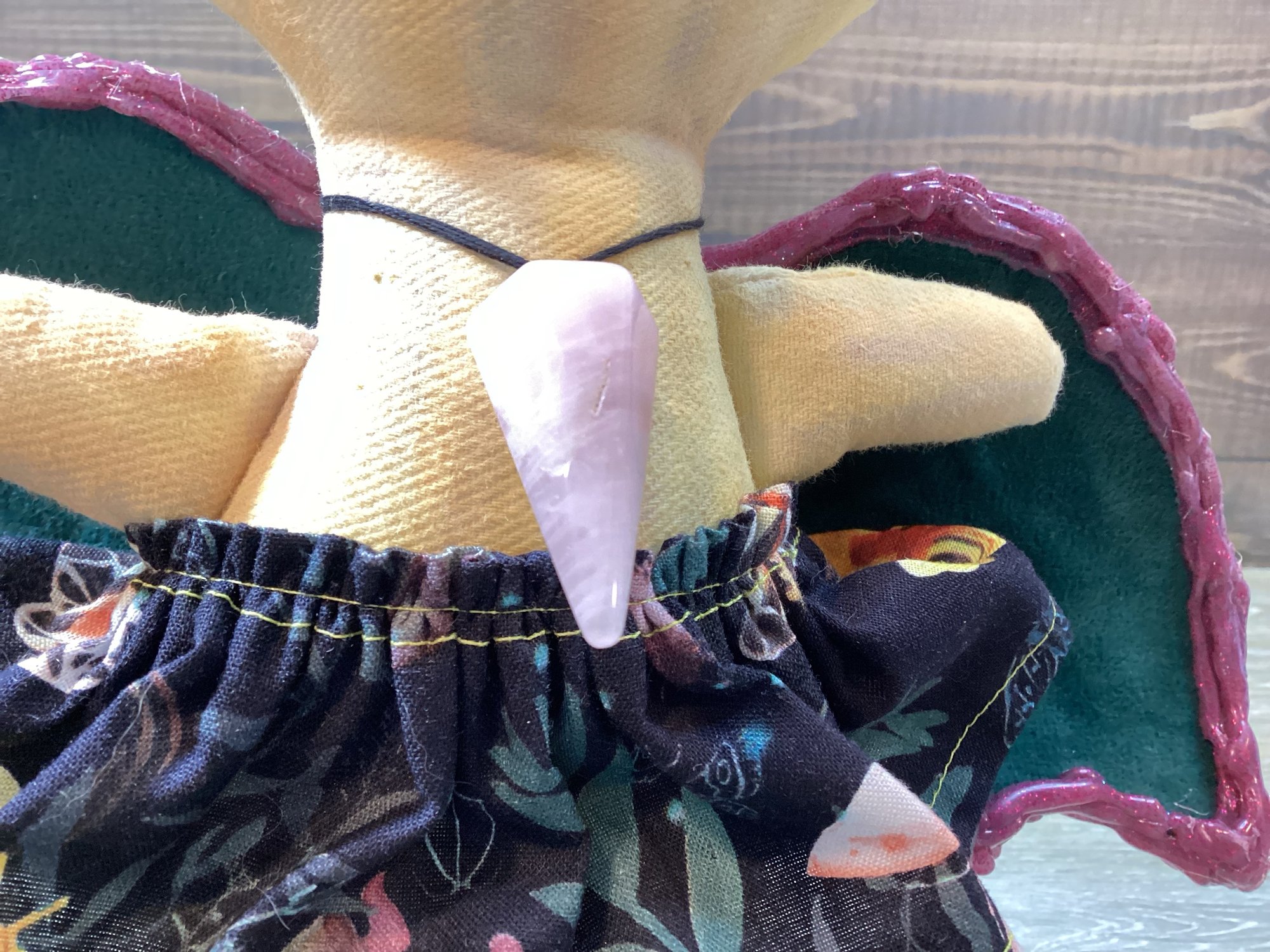 The stone around her neck is a Rose Quartz. It has been saged and has intentions into it to help you on your spiritual journey.