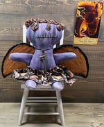 She is made from cotton fabric that I color with pastels. She is firmly stuffed with fiberfill and will sit with some support with her wings. Her eyes are buttons and her mouth is sewn on with embroidery floss.