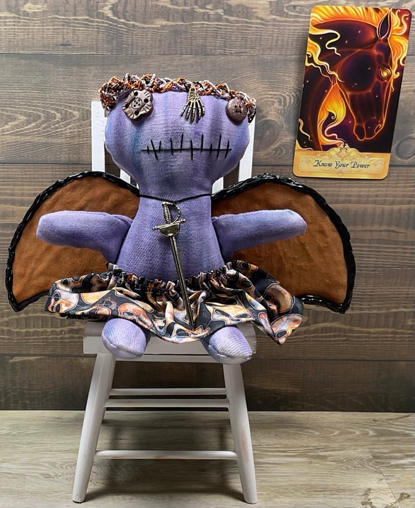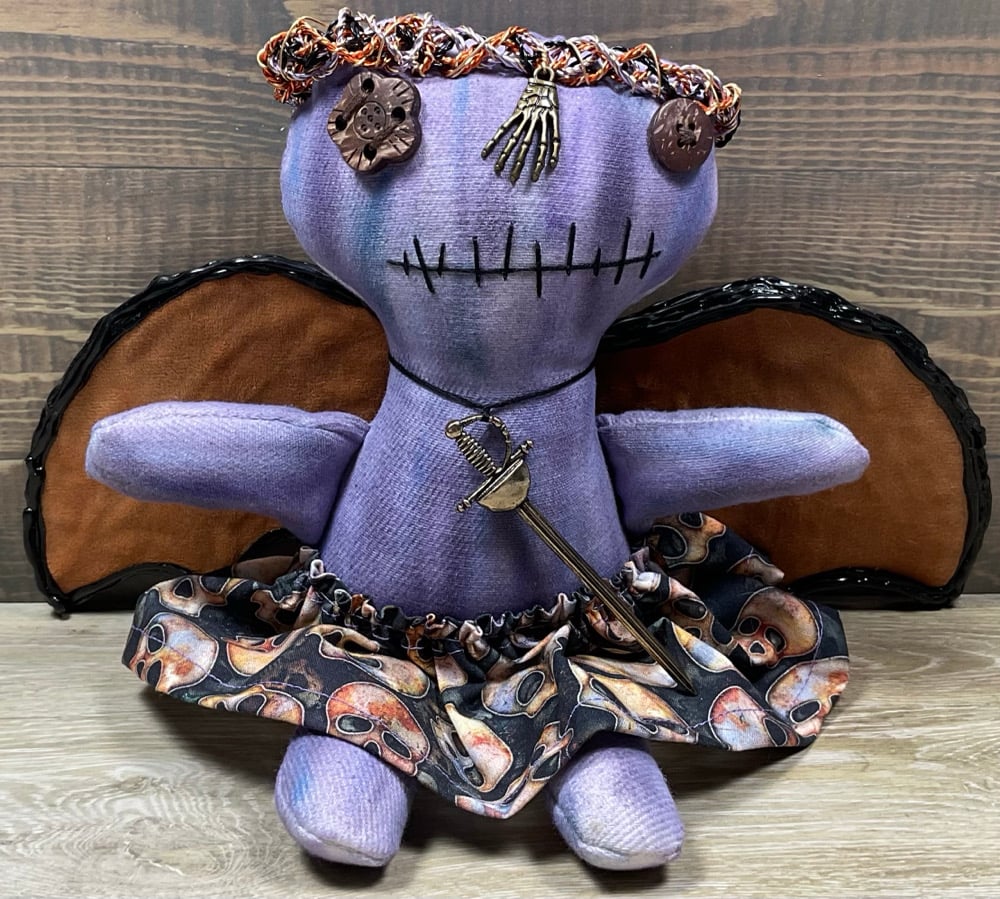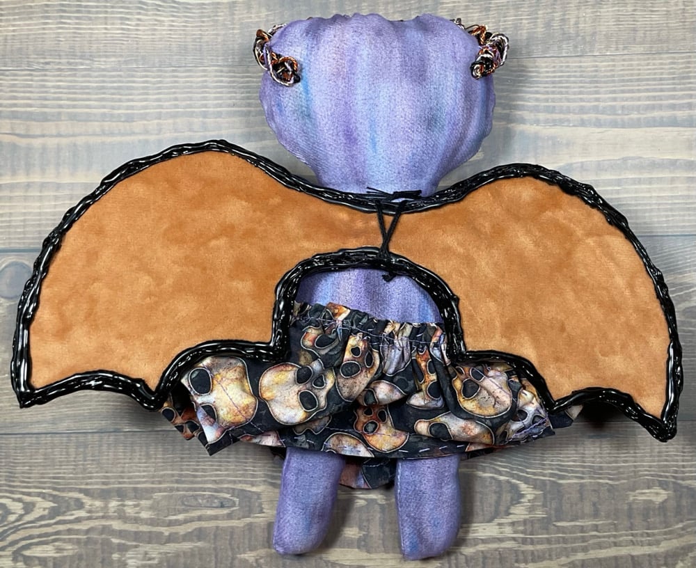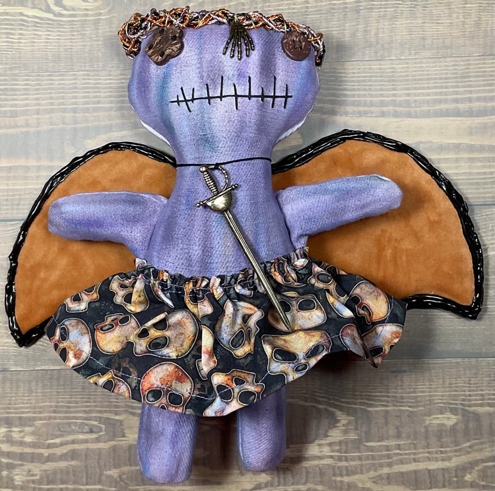 Her wings are made with two pieces of fabric hot glued together with a stabilizer in between and hot glue all around. Her skirt is cotton with a decorative necklace to match. She is wearing a wire wrapped head piece that has a charm woven into it.