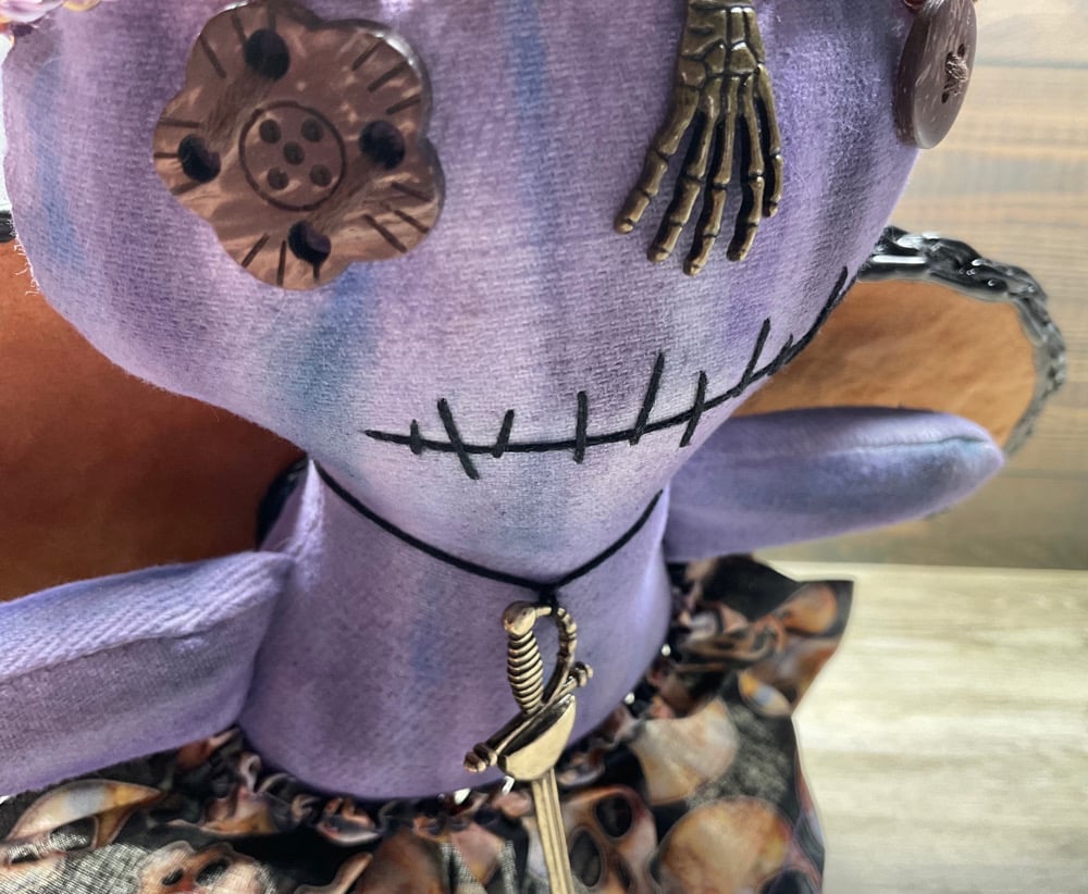 NOT INTENDED FOR CHILDREN! She has buttons and small parts that could easily be eaten. She is intended for decoration only. She will NOT stand up to rough play and can’t be machine washed.