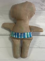 He is made from cotton fabric that I color with pastels. He is firmly stuffed with fiberfill and will sit with some support. His eyes are buttons and his mouth is sewn on with embroidery floss. His belt is cotton with a decorative belt buckle to match.