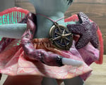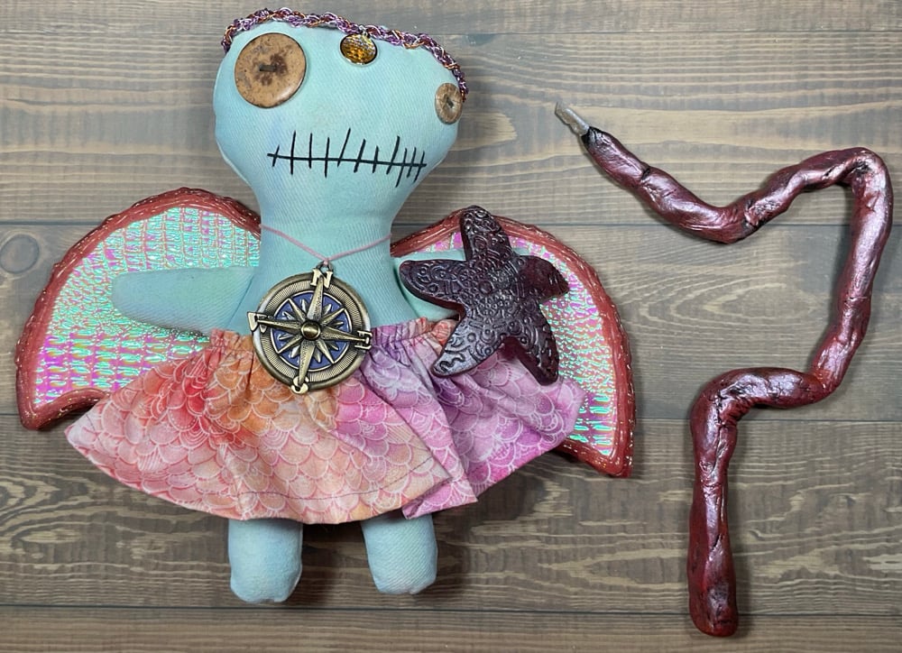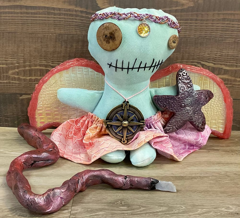 Her shield and wand are both handmade using air drying clay and are hand painted. The starfish shield can be taken off her arm or can be placed next to her. The wand is her gift to you, to help you on your journey. The stone on the top of the wand is a Blue Lace Stone. The stone has been saged and has intentions in it to help you on your spiritual journey.