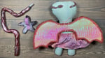 Her wings are made with two pieces of fabric hot glued together with a stabilizer in between and hot glue all around. Her skirt is cotton with a decorative necklace to match. She is wearing a wire wrapped head piece that has a charm woven into it.
