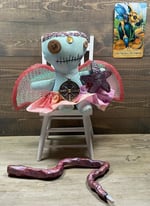 NOT INTENDED FOR CHILDREN! She has buttons and small parts that could easily be eaten. She is intended for decoration only. She will NOT stand up to rough play and can’t be machine washed.