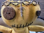 NOT INTENDED FOR CHILDREN! He has buttons and small parts that could easily be eaten. He is intended for decoration only. He will NOT stand up to rough play and can’t be machine washed.