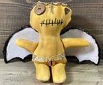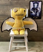 He is made from cotton fabric that I color with pastels. He is firmly stuffed with fiberfill and will sit with some support with his wings. His eyes are buttons and his mouth is sewn on with embroidery floss.