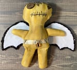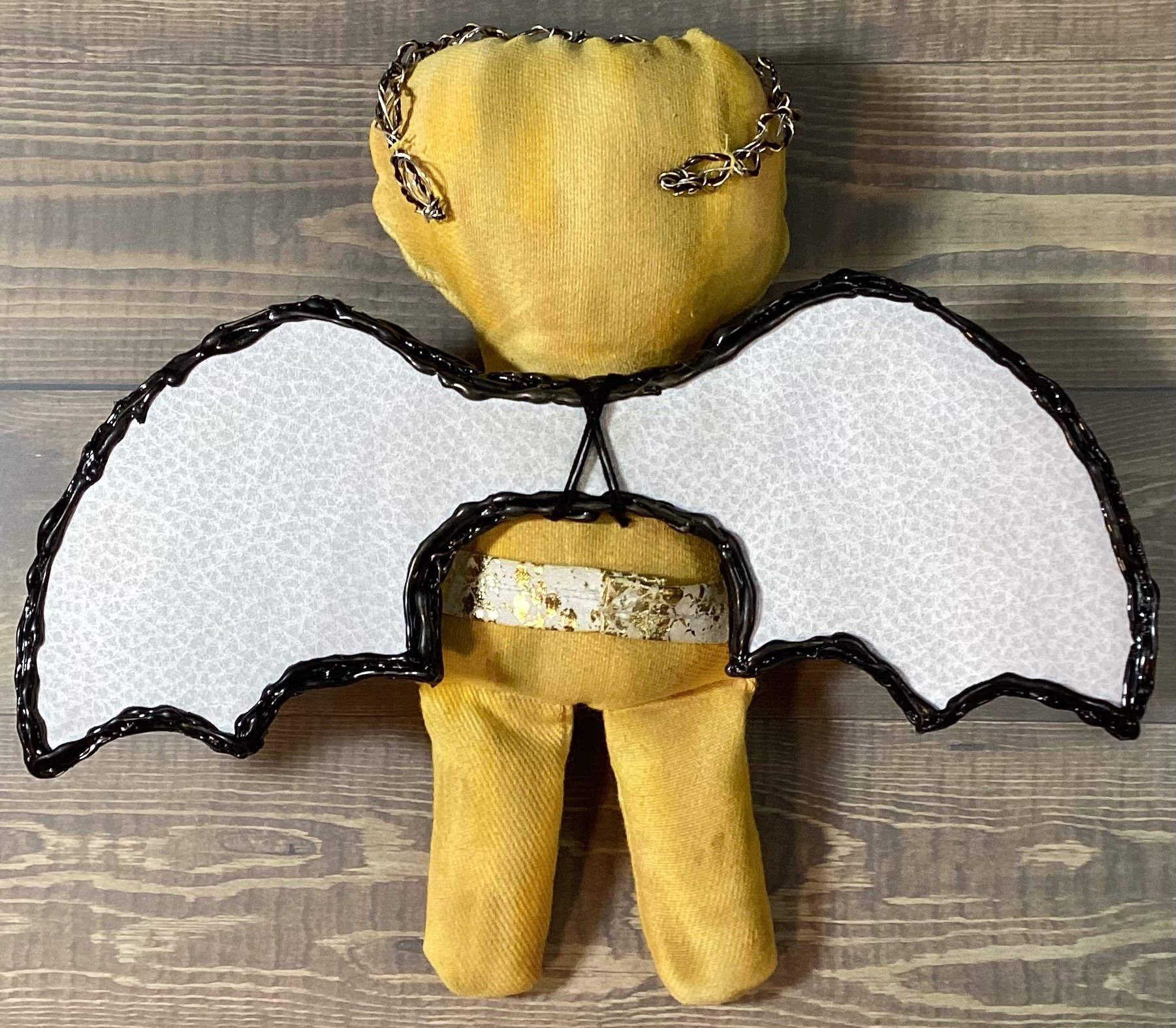 His wings are made with two pieces of fabric hot glued together with a stabilizer in between and hot glue all around. His belt is cotton with a decorative belt buckle to match. He is wearing a wire wrapped head piece that has a charm woven into it.