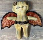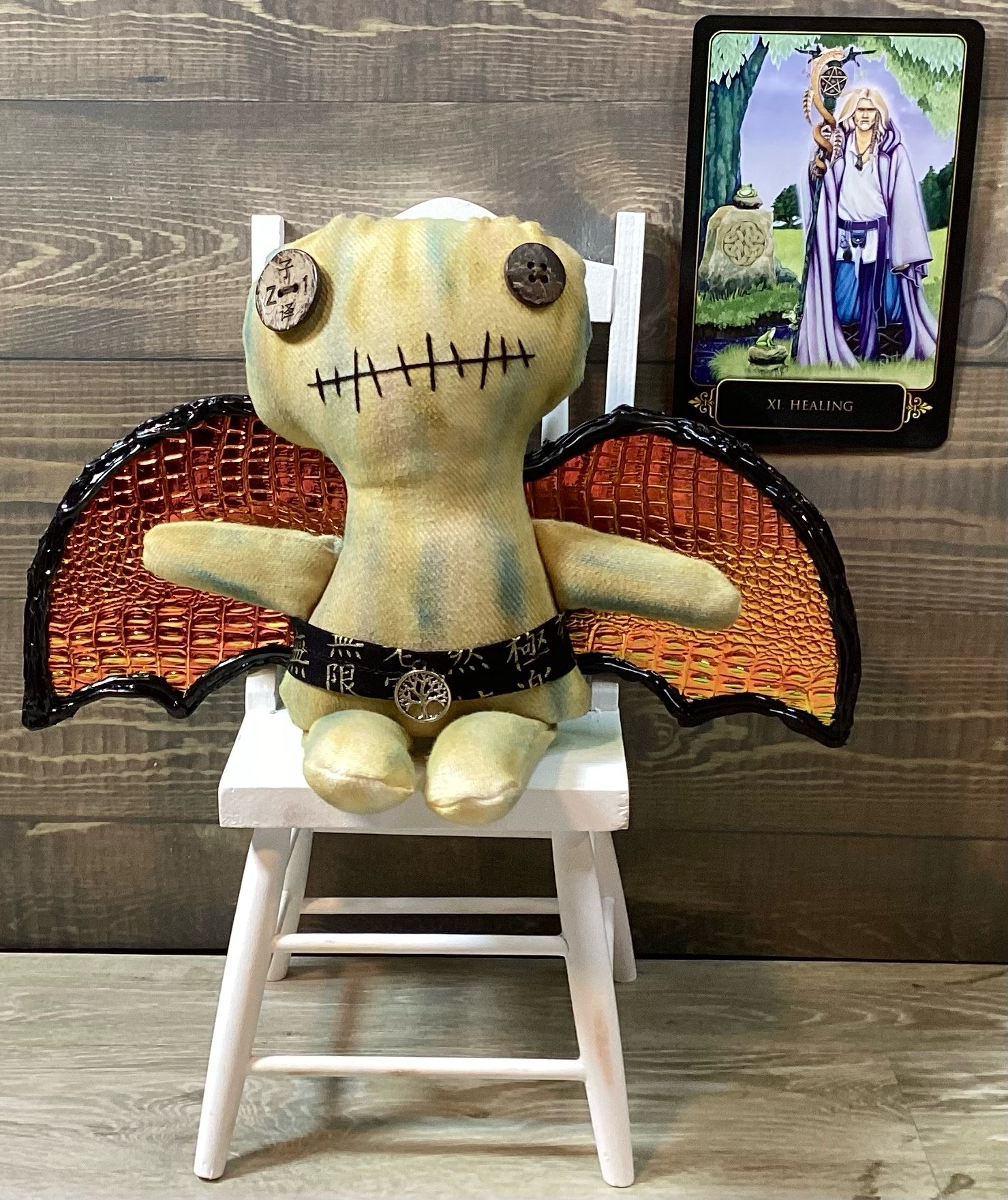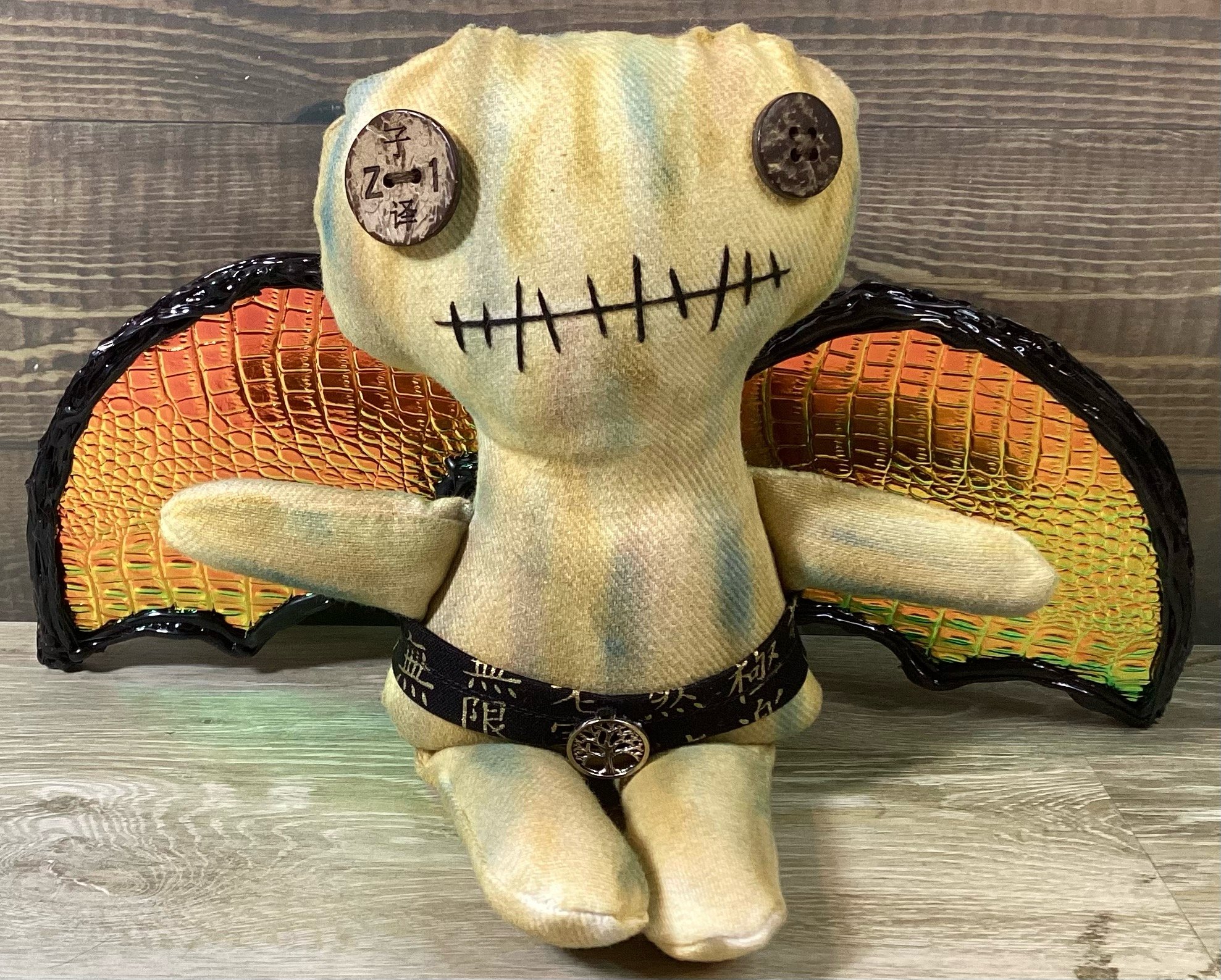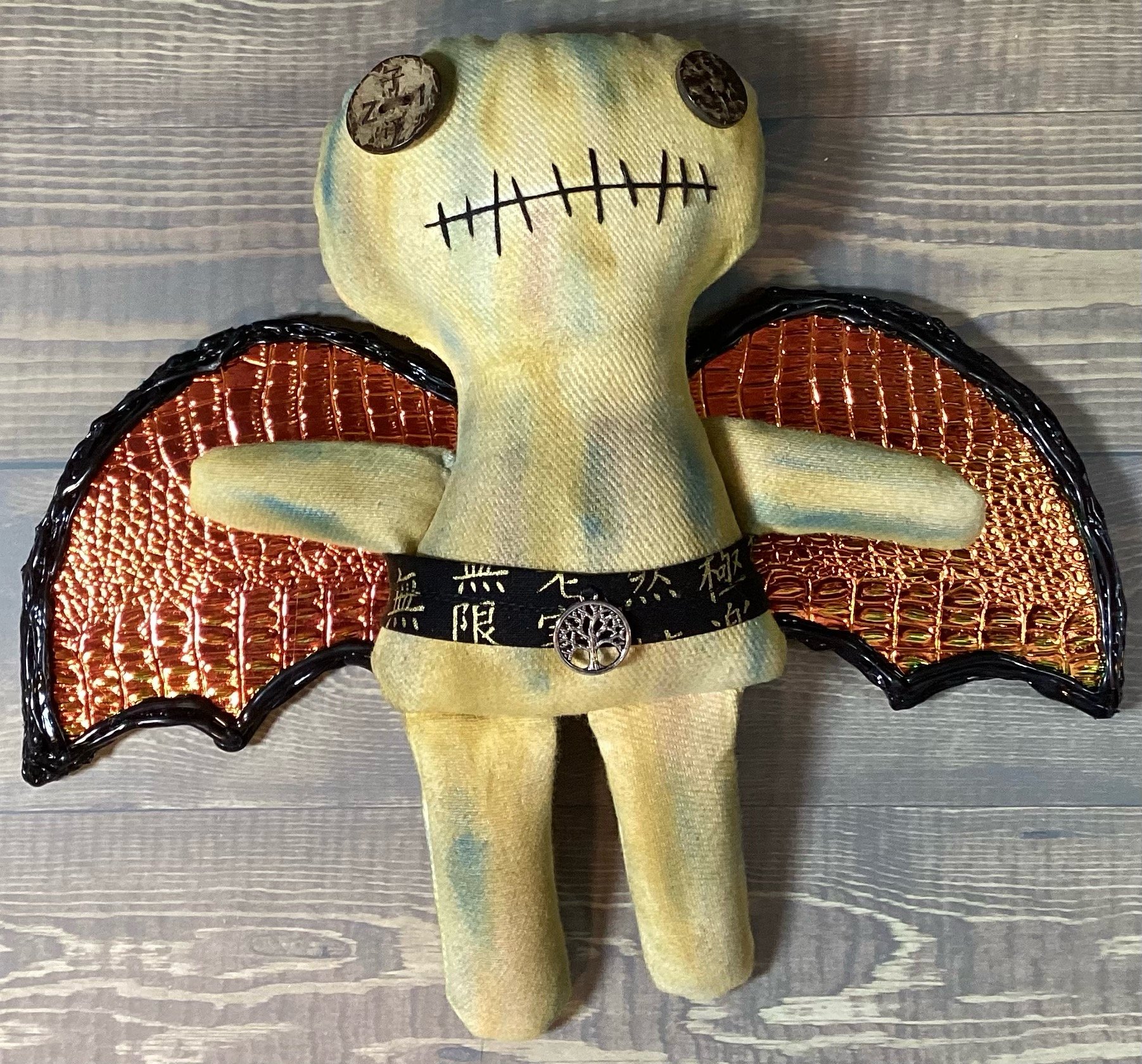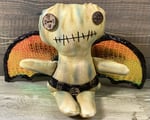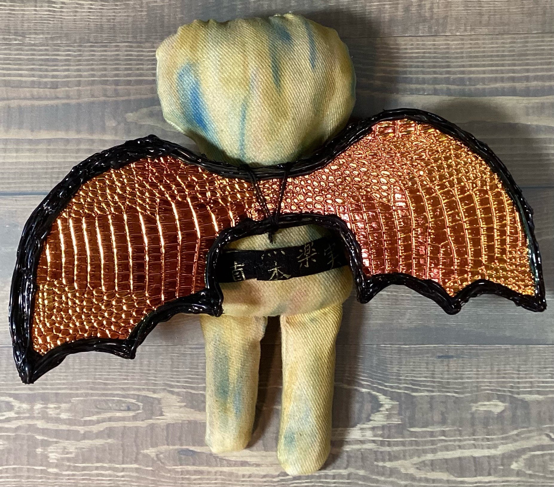 He is made from cotton fabric that I color with pastels. He is firmly stuffed with fiberfill and will sit with some support with his wings. His eyes are buttons and his mouth is sewn on with embroidery floss. His wings are made with two pieces of fabric hot glued together with a stabilizer in between and hot glue all around. His belt is cotton with a decorative belt buckle to match.