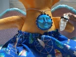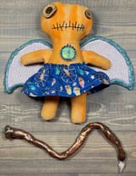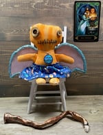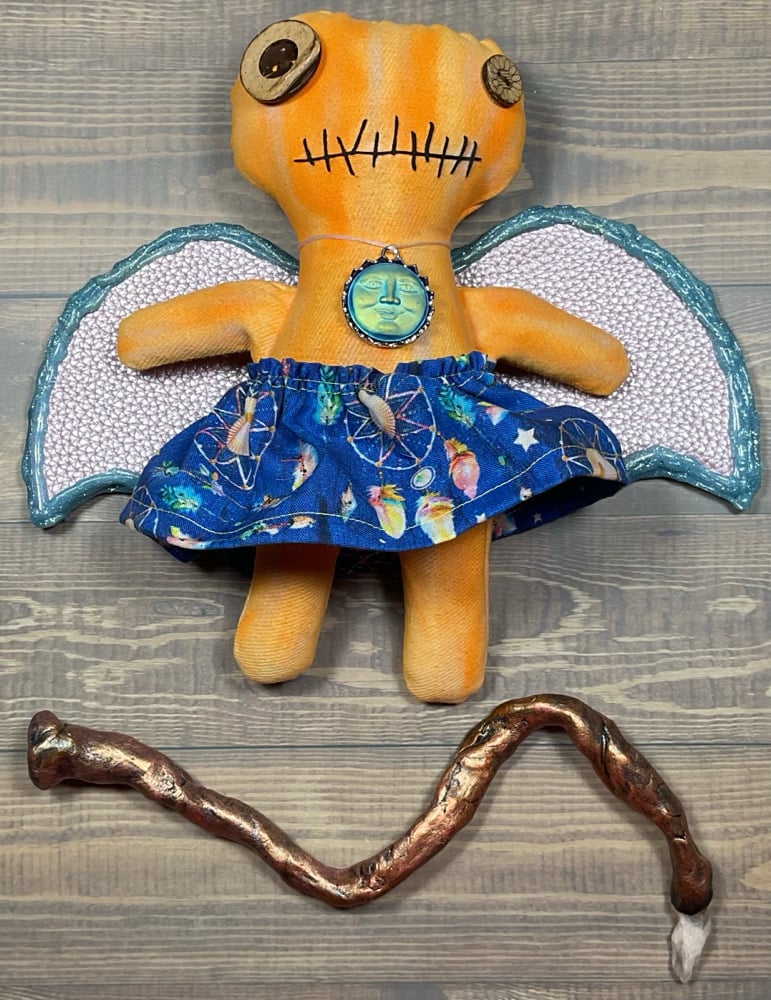 Her wings are made with two pieces of fabric hot glued together with a stabilizer in between and hot glue all around. Her skirt is cotton with a decorative necklace to match.